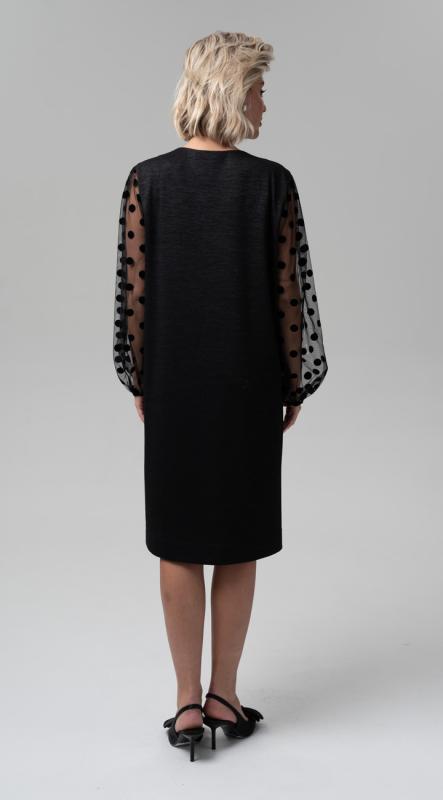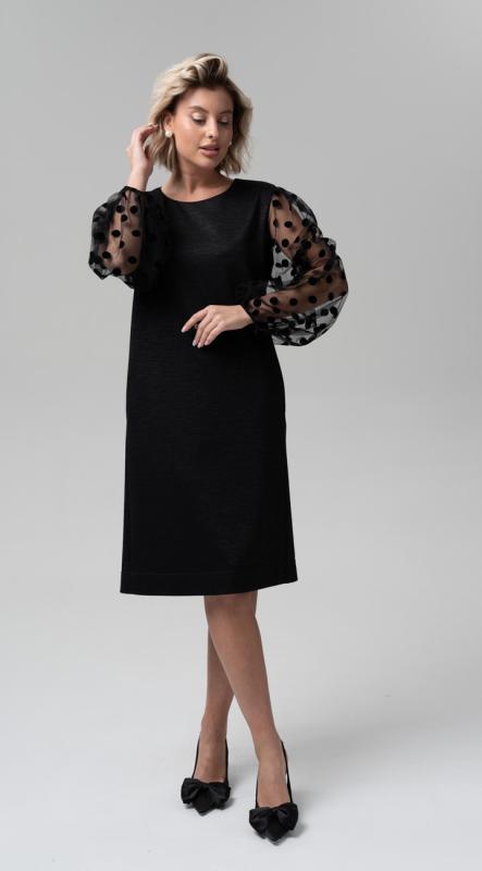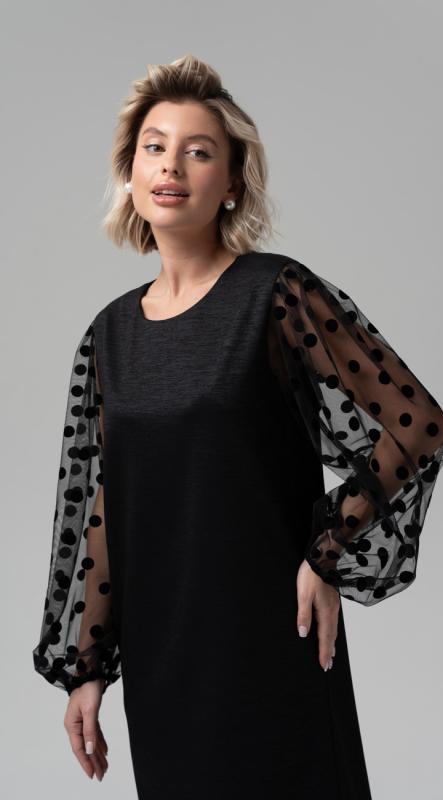 Комбинированное платье прямого силуэта с фантазийными рукавами из трикотажного полотна в сочетании с сеткой - поможет создать стильный и запоминающийся образ. Вертикальные рельефы с карманами - зрительно вытягивают силуэт и добавляют актуальности.