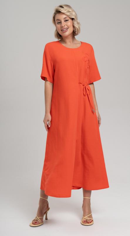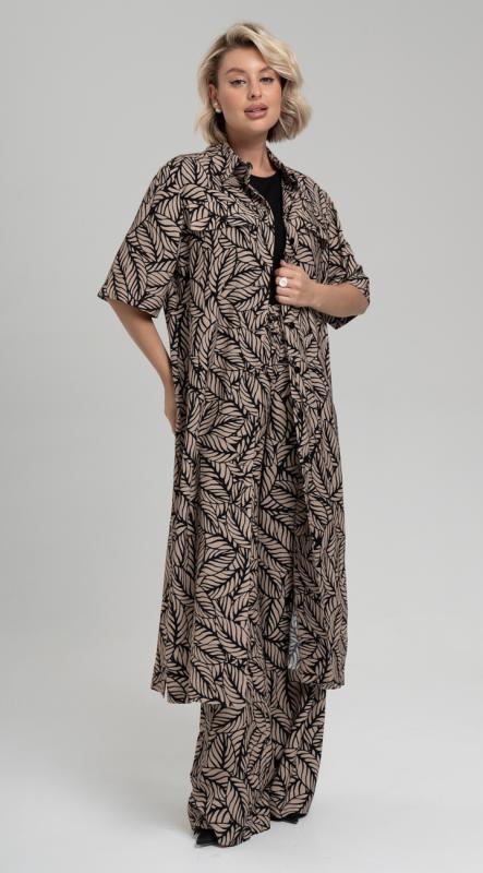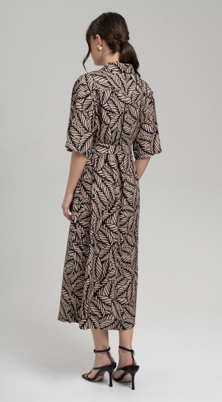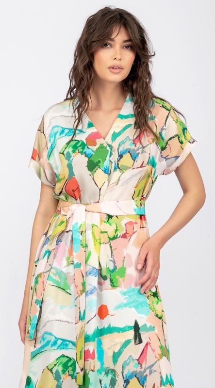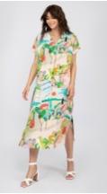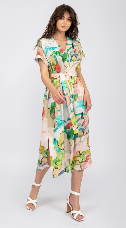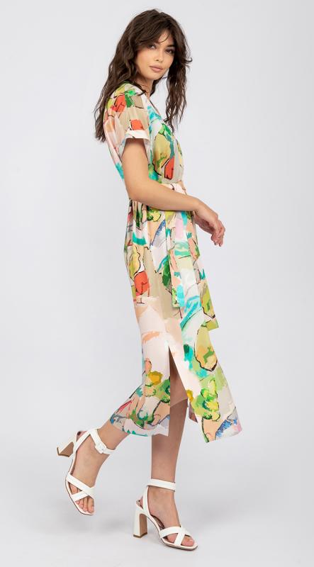 Распашное платье длиной midi свободного силуэта с разрезами в боковых швах и с отложным воротником на стойке из вискозы с добавлением волокон льна с флористическим принтом – идеальный вариант для жаркого лета. Короткий комфортный рукав. Застежка на петли и пуговицы. В комплекте съемный пояс.