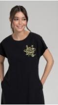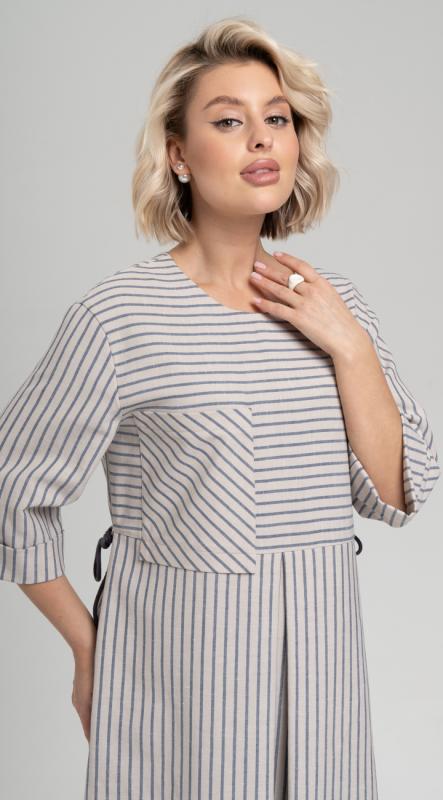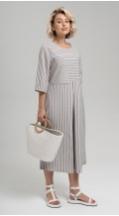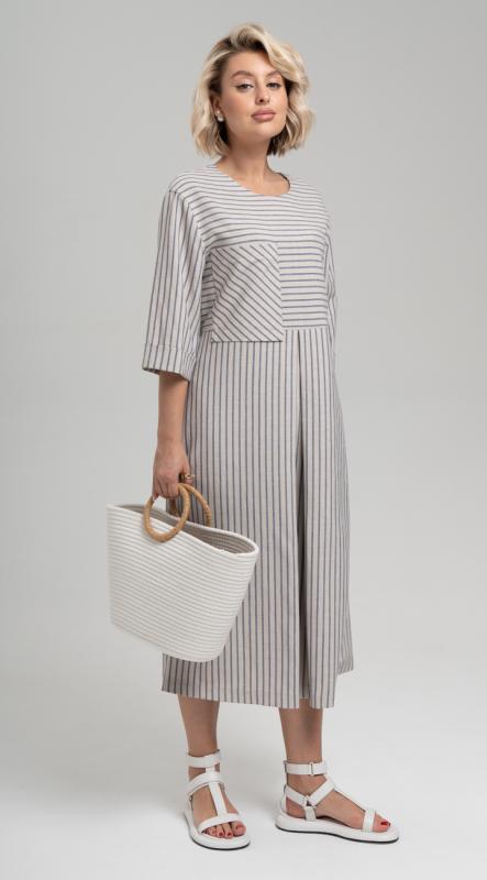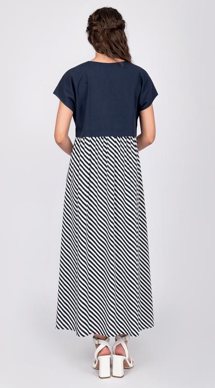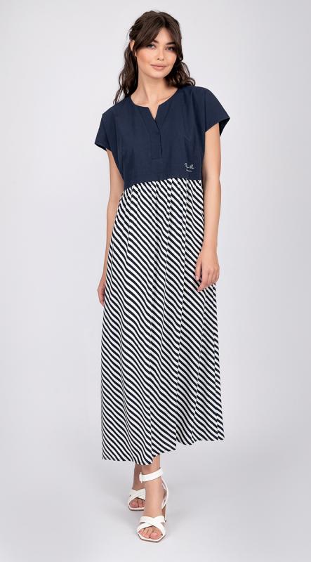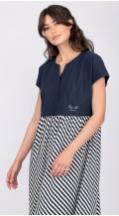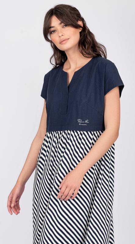 Комбинированное платье свободного кроя со спущенной линией плеча и отрезной юбкой выше талии из легкого хлопка в сочетании с вискозой в полоску - отлично подойдет для летних теплых дней. Добавит эксклюзивности термотрансфер по переду.
