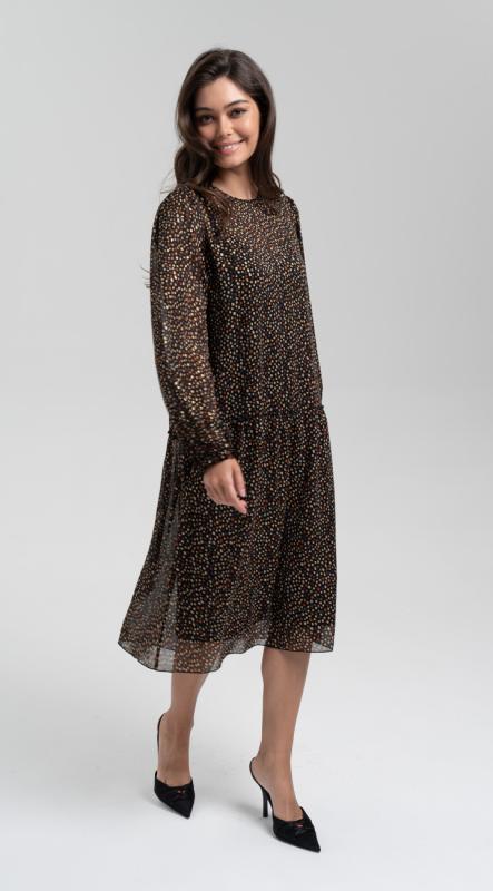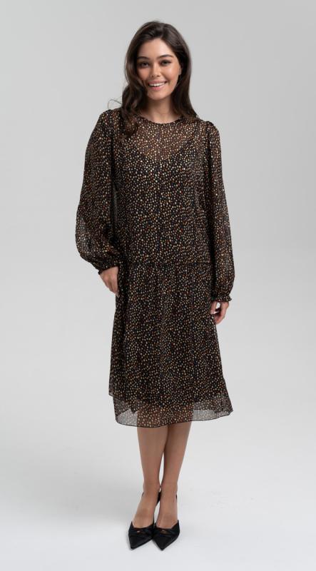 Платье А-силуэта длиной midi из прозрачного района - гарантирует, что вы будете выглядеть стильно, чувствуя себя комфортно. Идеальный силуэт в вашем гардеробе для праздничного сезона. Воланы на рукавах придают фактурность и подчеркнут женственность. Втачной рукав полной длины. Платье дополнено съемным поясом и комбинацией из подкладочного трикотажа на тонких регулируемых бретелях.