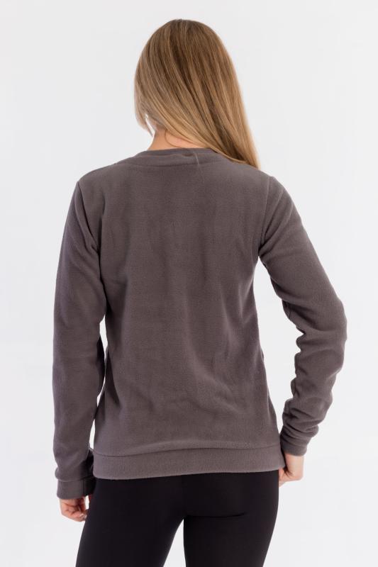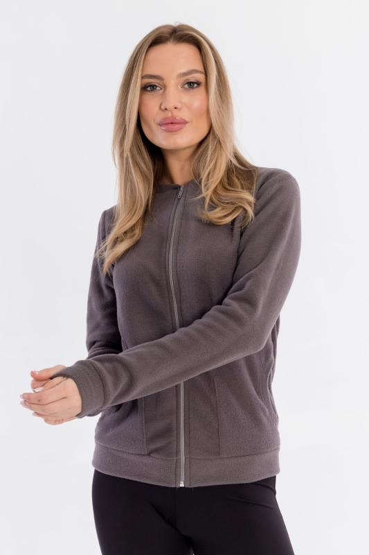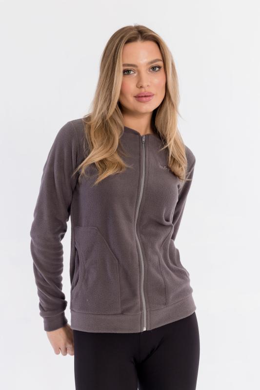 Женская толстовка на молнии выполнена из флиса. Длинный рукав, спереди расположены накладные карманы.
