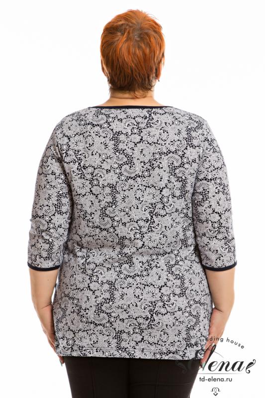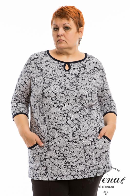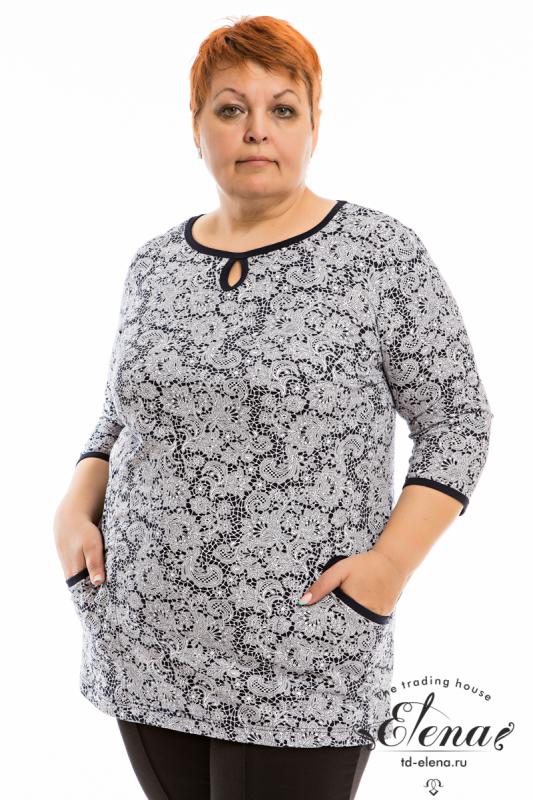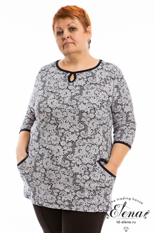 Футболка выполнена из хлопкового набивного полотна. Круглый вырез горловины, рукава длиной 3-4. Силуэт свободный, прямой. Спереди расположены два кармана, в качестве отделки на горловине "