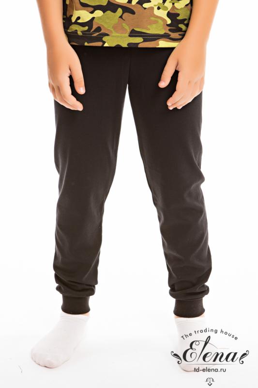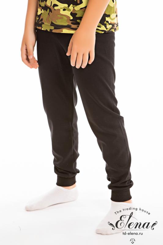 Брюки детские, однотонные (начёс 3-х нитка), с поясом на широкой резинке со шнуром. По бокам в качестве отделки вшита молния (имитация под карман), спереди декоративная нашивка. На коленях отстрочка нитками в цвет полотна, низ брюк на манжетах.