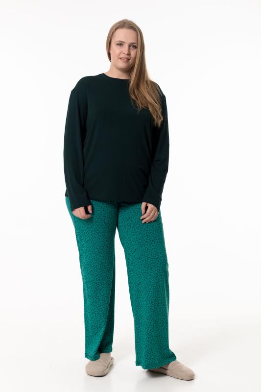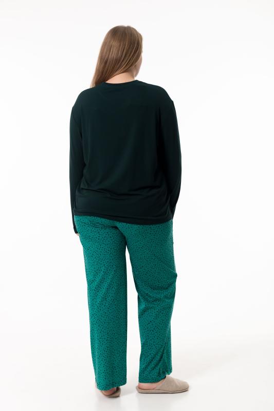Женский костюм выполнен из комбинации хлопкового полотна и нежной вискозы. Костюм состоит из однотонного лонгслива и брюк. Лонгслив из вискозы со спущенной линией плеча, вырез горловины оформлен аккуратной притачной планкой. Брюки из кулирки с поясом на удобной резинке и дополнены практичными боковыми карманами. Идеальный комплект для комфортного отдыха.
