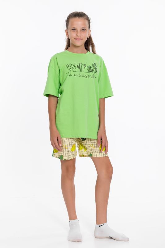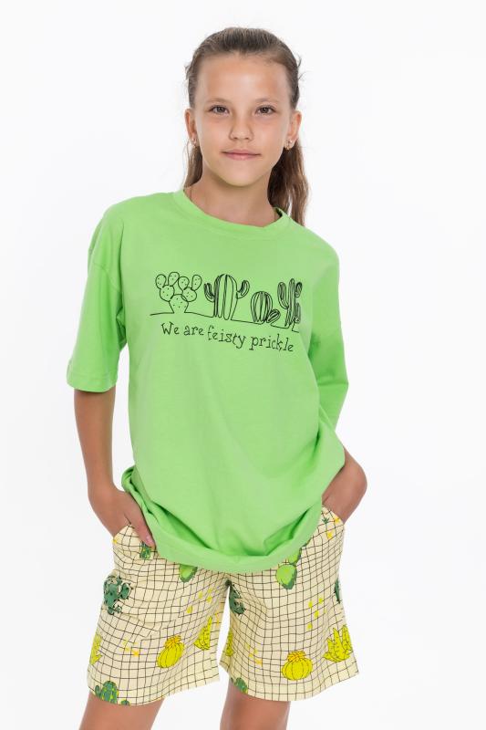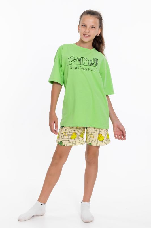 Пижама для девочек состоит из свободных шорт и футболки, выполненных из мягкой и приятной на ощупь ткани — кулирки (100% хлопок). Футболка свободного кроя с круглым вырезом горловины и рукавом до локтя. Особенностью модели является спущенная линия плеча и интересный принт спереди. Шорты также выполнены из кулирки реактив, они удлинённые, свободного кроя и имеют боковые карманы. Пояс на широкой резинке обеспечивает комфортную посадку. Изготовленная из натуральной ткани, пижама обеспечит комфорт в течение всего дня.