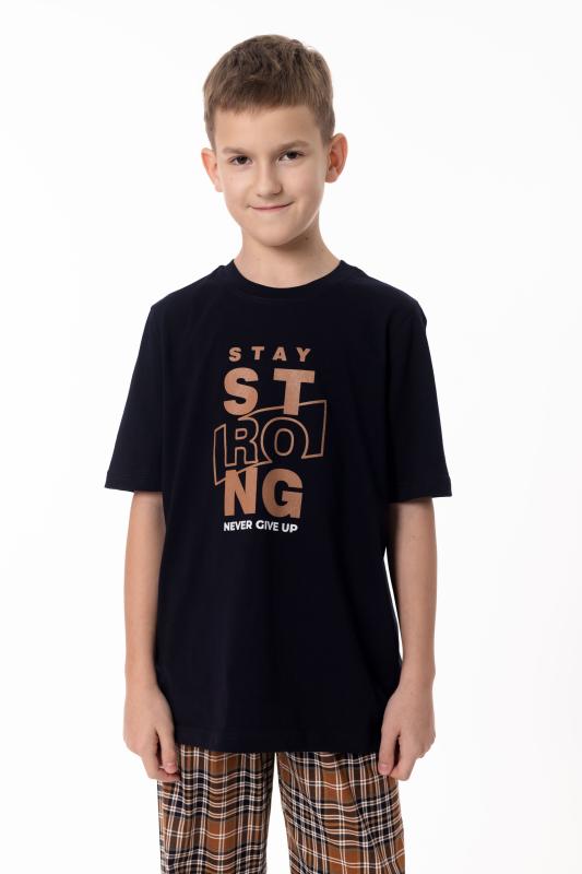 Пижама выполнена из натурального хлопкового полотна, обеспечивающего комфорт и приятные ощущения во время сна и отдыха. Комплект состоит из удобных брюк в клетку с эластичным поясом и однотонной футболки с коротким рукавом. Круглый вырез горловины аккуратно оформлен бейкой, а спереди расположен принт, придающий модели аккуратный и уютный акцент. Пижама отлично подойдёт для комфортного домашнего отдыха и спокойного сна.