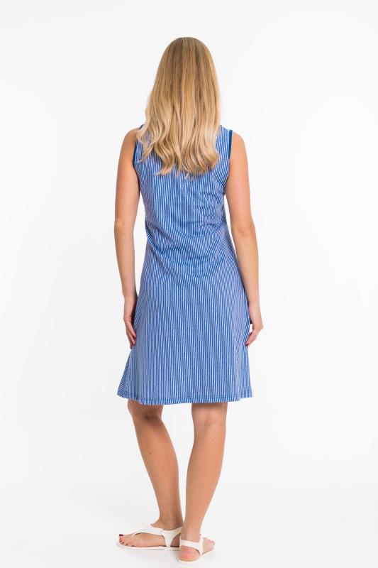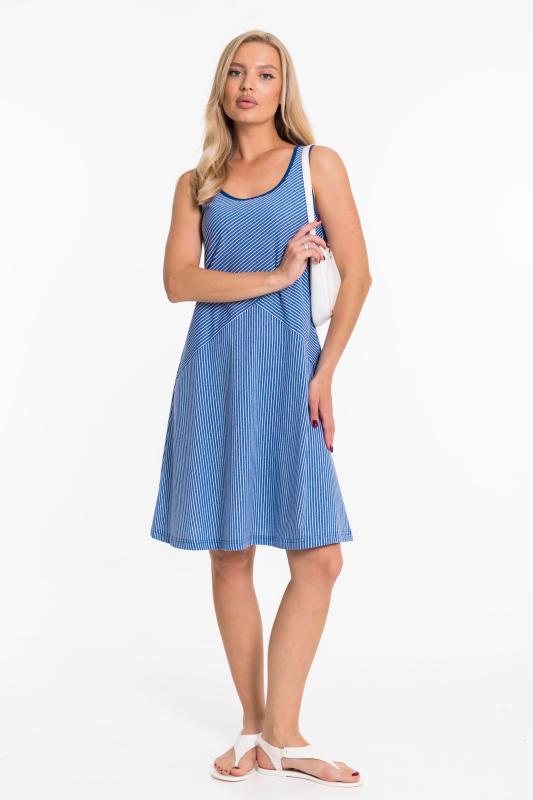 Сарафан выполнен из кулирки в вертикальную полоску. Детали сшиты с разным направлением полос, что делает модель сарафана интересной. Горловина и проймы обработаны однотонной бейкой. Внизу силуэт сарафана расклешён.