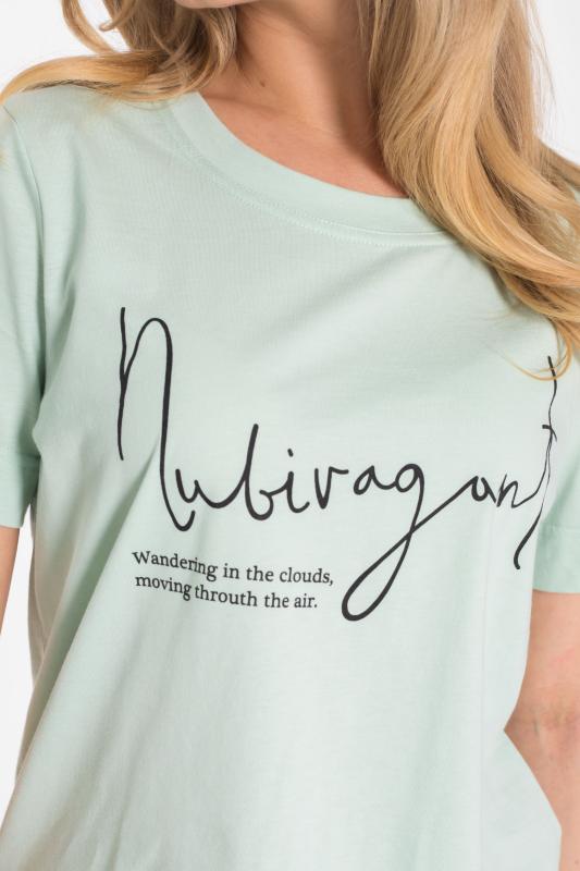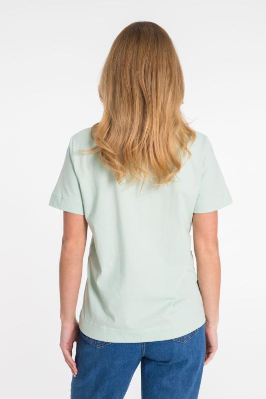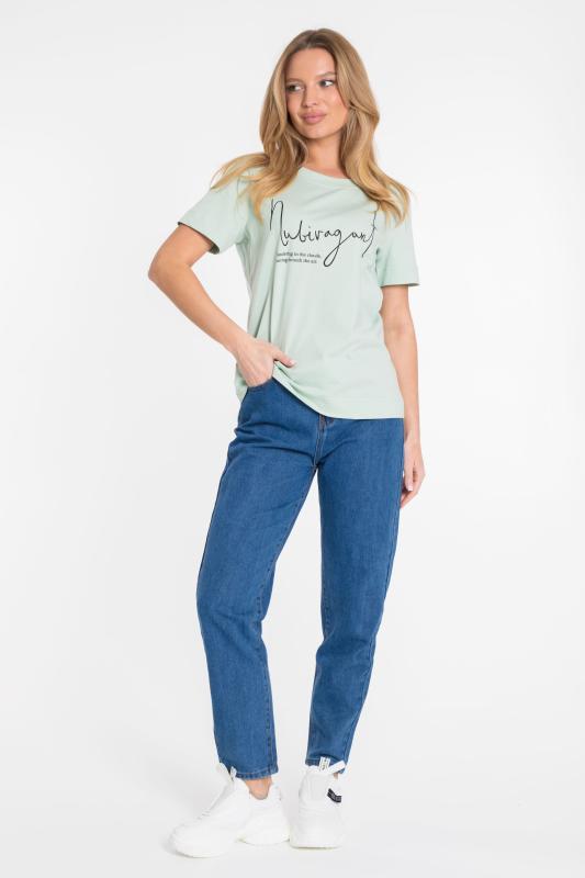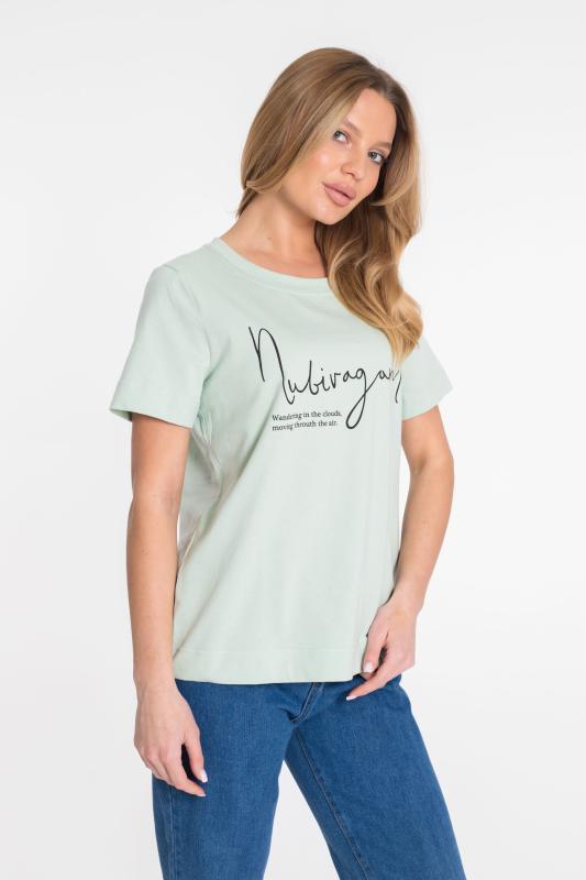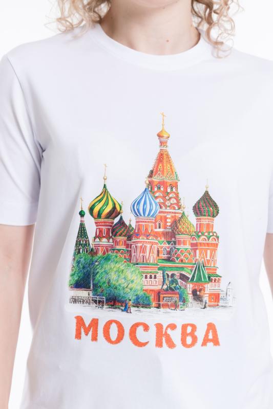 Футболка из однотонной кулирки, 100% хлопок. С коротким втачным рукавом и притачной планкой по круглому вырезу горловины. На полочке принт.