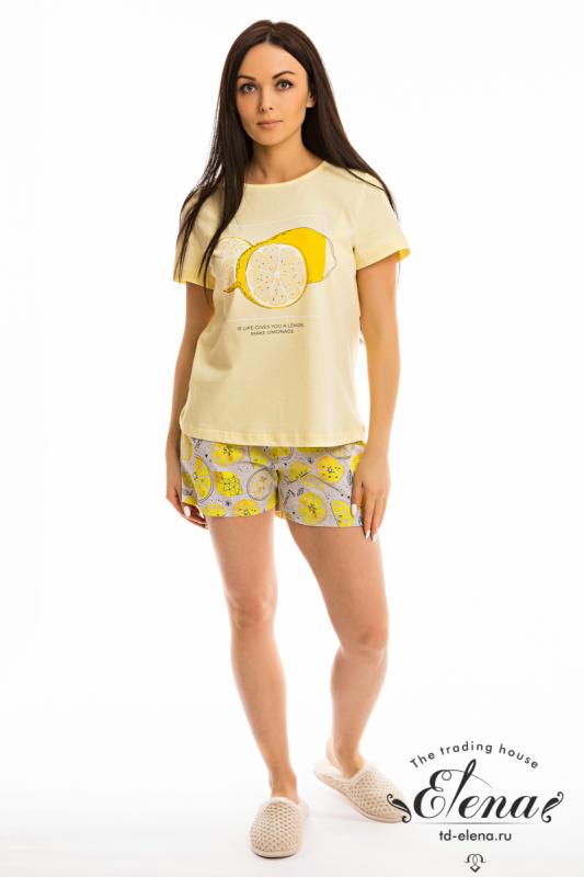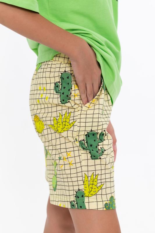 Комплект выполнен из кулирки, 100% хлопок, состоит из шорт и футболки с коротким втачным рукавом. Футболка с принтом спереди и круглым вырезом горловины, оформленным бейкой. Шорты с боковыми карманами и притачным поясом на резинке.