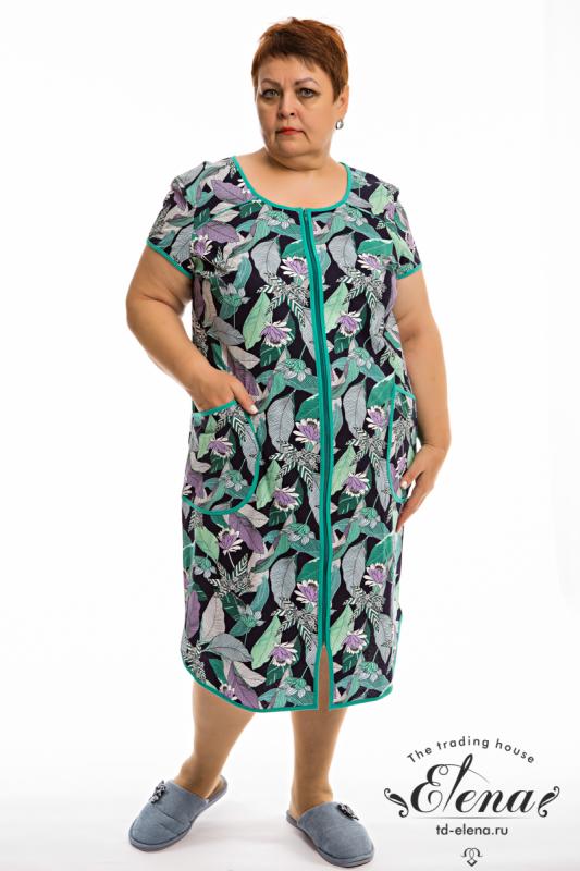 Халат с рукавом длиной 3-4 выполнен из велсофта. Центральная застёжка на молнию, спереди размещены накладные карманы. Срезы горловины, карманов и низа рукавов обработаны бейкой. Размерный ряд: 42-56.