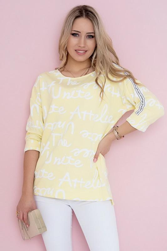 Блузка из средней плотности мягкого, скользковатого на ощупь, трикотажа. Отделка - мягкий принт. Буквы - с металлическим отливом клеенчатая, мягкая аппликация Состав: 94% вискоза, 6% эластан