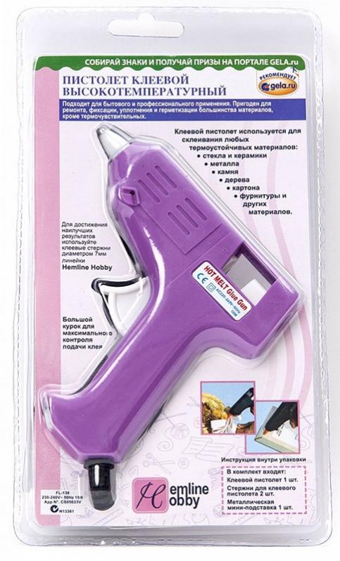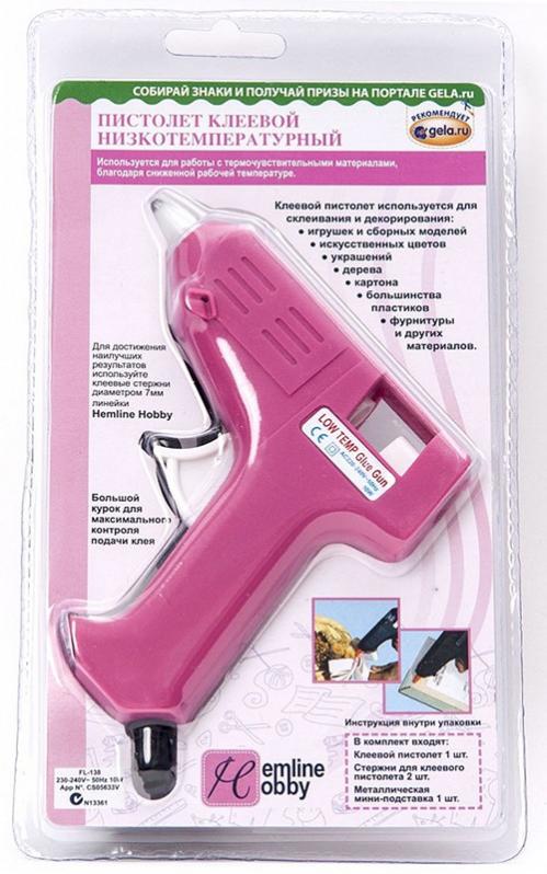 Комплектация: 1 клеевой пистолет, 2 стержня для пистолета диаметром 7 мм, 1 металлическая мини-подставка. Пистолет используется для работы с термочувствительными материалами, благодаря сниженной рабочей температуре. С его помощью можно склеивать и декорировать: игрушки и сборные модели, искусственные цветы, украшения, дерево, картон, большинство пластиков, фурнитуру и другие материалы. Для достижения наилучших результатов используйте клеевые стержни диаметром 7 мм линейки Hemline Hobby. Курок на пистолете специально сделан большим для максимального контроля подачи клея.ИНСТРУКЦИЯ ПО ИСПОЛЬЗОВАНИЮ ПИСТОЛЕТА1. Убедитесь в том, что склеиваемые материалы устойчивы к температуре плавления клея данного пистолета, предварительно сделав тесты на образцах.2. Убедитесь в том, что склеиваемые поверхности чистые и сухие.3. Направьте сопло пистолета на склеиваемую поверхность и нажимайте на курок до тех пор, пока на неё не вытечет необходимое количество клея.4. Сдавливайте склеиваемые поверхности в течение 15 секунд.5. У