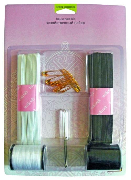 В черном тканевом клатче на молнии содержится: катушки со швейными нитками -24 цвета+2 меланж, иглы швейные в контейнере различных номеров - 30 шт, булавки наметочные-40 шт,нитевдеватель - 2 шт, иглы самовдеваемые -12 шт, подушечка для игл- 1 шт, кусачки для ногтей, вспарыватель - 1 шт, металлический наперсток - 2 шт, сантиметр - 1 шт, ножницы - 1 шт, иглы в шприце-5 шт, пинцет-1 шт, карандаш - 1 шт, крючок №3,5 мм, булавки английские – 5 шт, мини набор с тремя пуговицами.