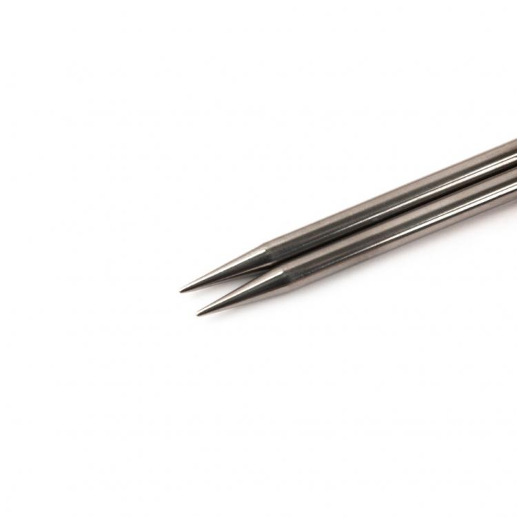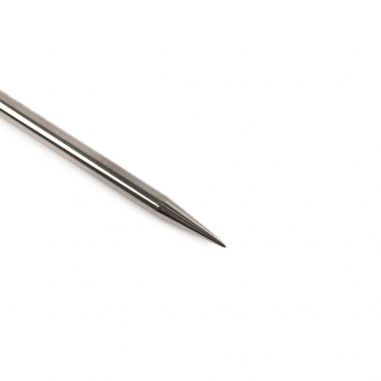 Спицы сделаны из высококачественной нержавеющей стали AISI 304 с гладкой отполированной поверхностью. Спицы внутри полые и легкие, что делает вязание комфортным, увеличивая скорость. Острые удлиненные кончики спиц идеально подходят для тонкой пряжи. Гладкий и изогнутый переход от спицы к леске, пряжа лучше скользит.