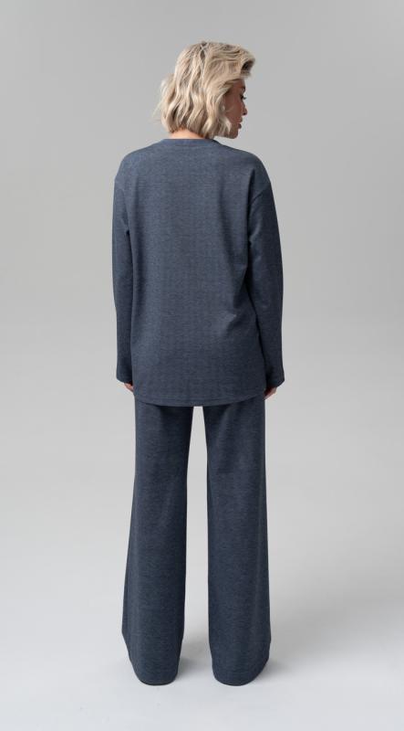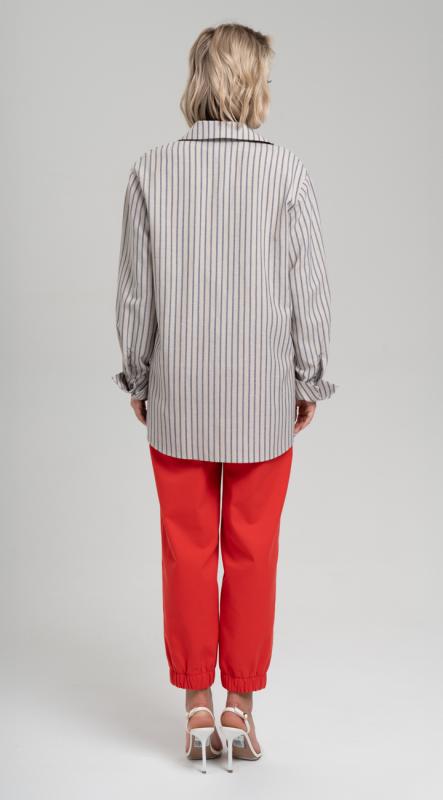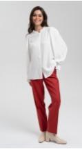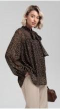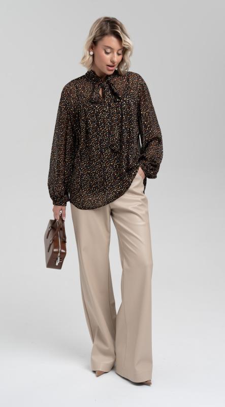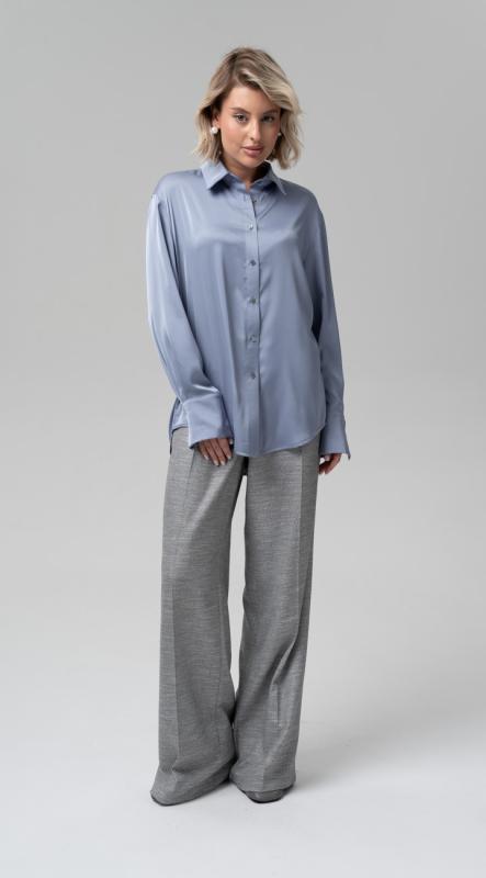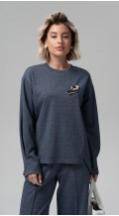 Стильная блуза свободного кроя из фактурного трикотажного полотна – будет органично смотреться как в повседневном образе, так и в офисном, создавая особенное настроение. Рукава полной длины на притачной высокой манжете. Металлизированный кант в швах - визуально удлиняет силуэт, добавляя этой модели сверкающую ноту.