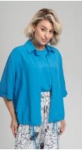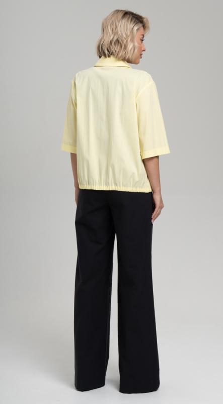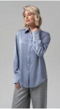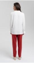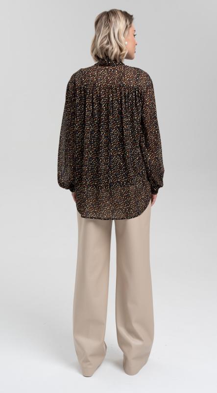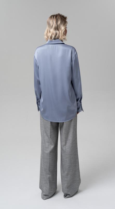 Блуза свободного кроя с оригинальной стойкой мягкой формы из струящейся ткани с деликатным блеском подойдет для любого повода — от праздничного ужина до деловой встречи. Втачной рукав полной длины на манжете. Застежка по спинке на две пуговицы и навесные петли.