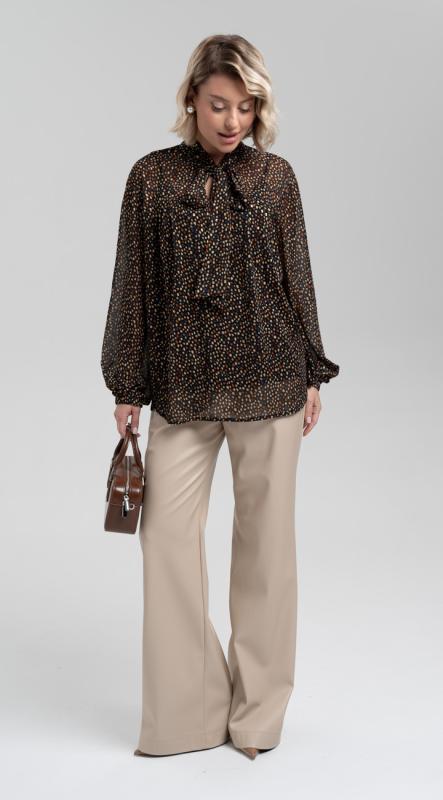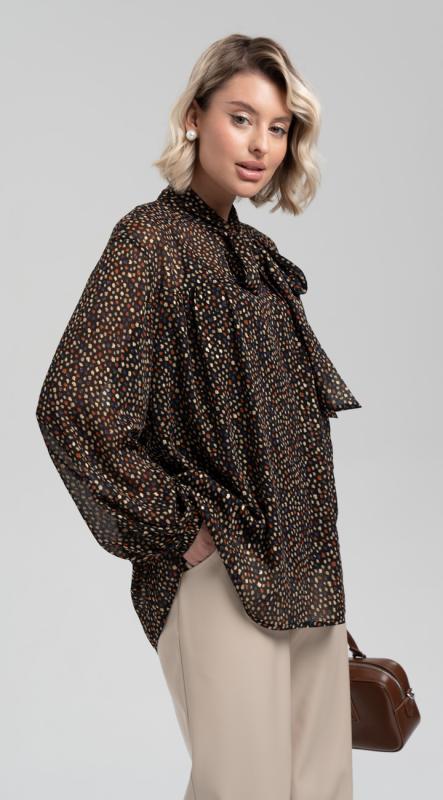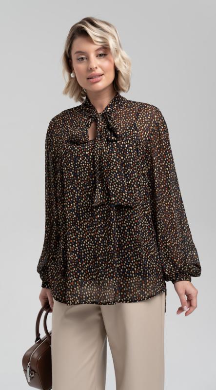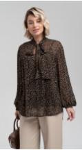 Стильная блуза свободного кроя из шифона со стойкой мягкой формы, переходящей в элегантный бант - станет украшением Вашего гардероба. Длинный широкий рукав мягкой формы с резиной по низу. В комплекте топ на тонких регулируемых бретелях из трикотажной вискозы.