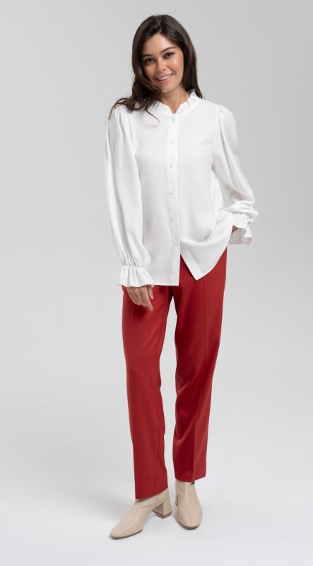 Эффектная блузка прямого покроя из струящейся ткани с приглушенным блеском - добавит романтичности в сезонный гардероб. Изящный рюш по вырезу горловины - подчеркнет женственность и без всяких сомнений сделает ваш образ эффектным и незабываемым. Выверенный крой и классическая длина - вот составляющие успеха этого изделия. Широкий втачной рукав полной длины с воланом. Застежка на петли и пуговицы.