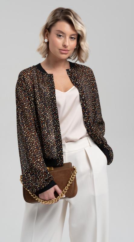 Бомбер прямого силуэта из костюмной поливизкозы с карманами и кулисой по низу - легко сочетает в себе комфорт и стиль. Широкий рукав рубашечного кроя имеет широкую подгибку с акцентной окантовкой, что позволяет завернуть его на мягкую манжету. Застежка на кнопки.