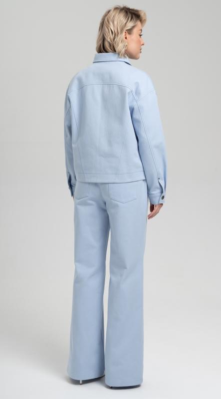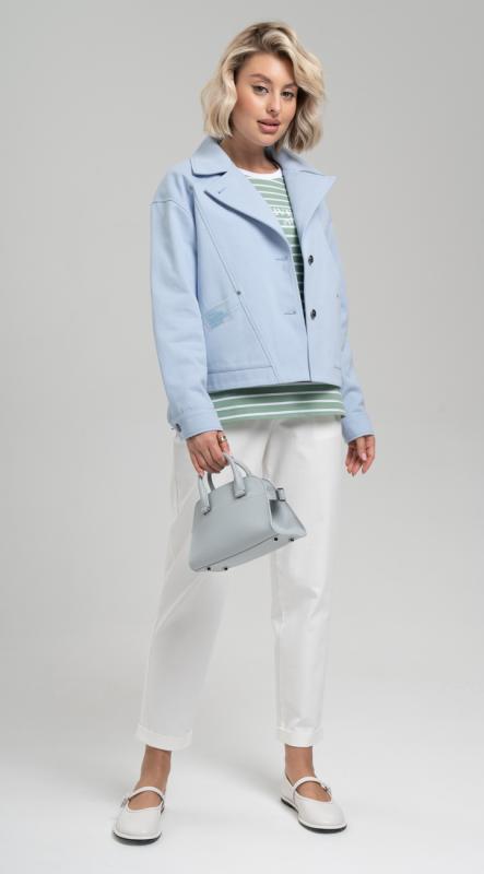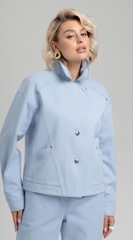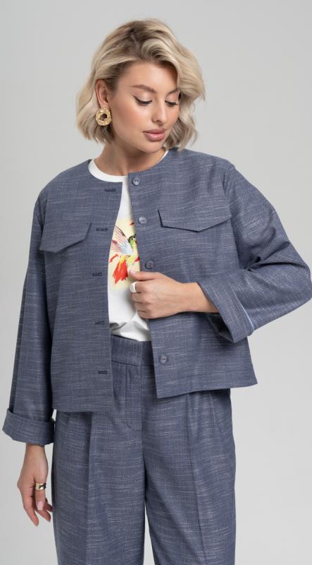 Укороченный джинсовый жакет свободного кроя с отложным воротником и карманами оригинальной формы из плотного денима с "