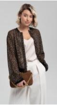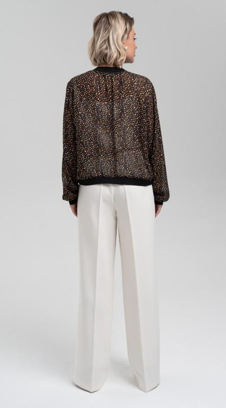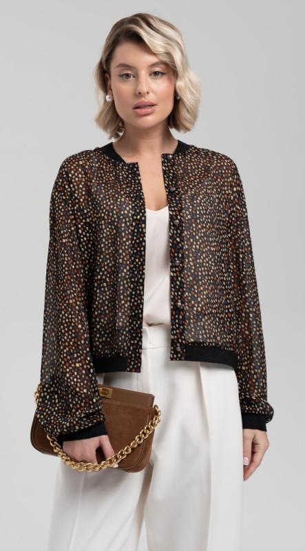 Бомбер прямого силуэта с карманами и кулисой по низу из костюмной поливизкозы с легким мерцанием - станет, несомненно, изюминкой осенне-зимнего гардероба. Авторский термотрансфер из черного бархата - подарит обладательнице хорошее настроение на целый день и без сомнения, сделают образ эффектным и незабываемым. Широкий рукав рубашечного кроя полной длины. Бомбер с манжетами и воротником из трикотажного кашкорсе. Застежка на кнопки.