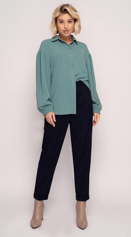. Рукав рубашечного кроя имеет широкую подгибку с акцентной окантовкой, что позволяет завернуть его на мягкую манжету. Застежка на петли и пуговицы.