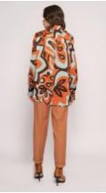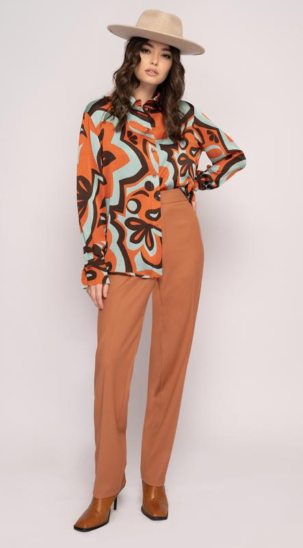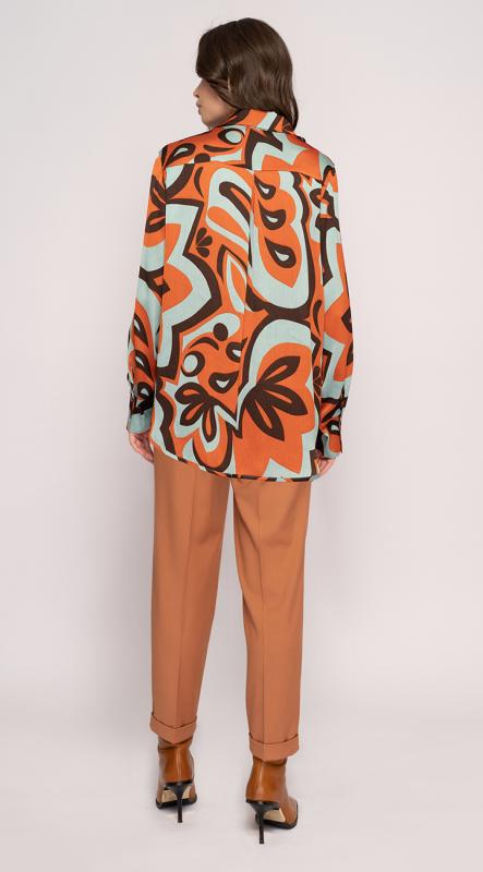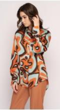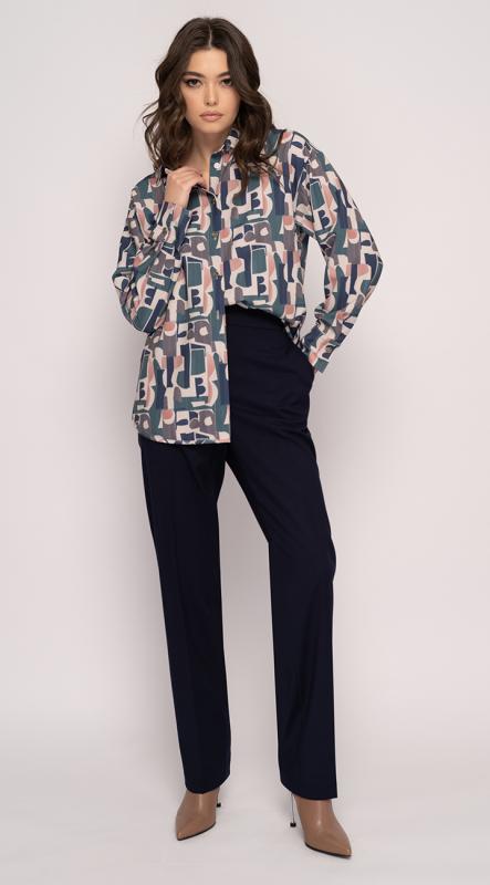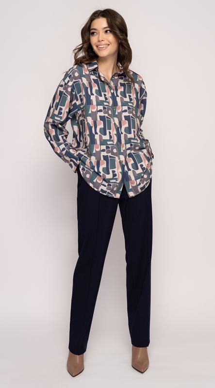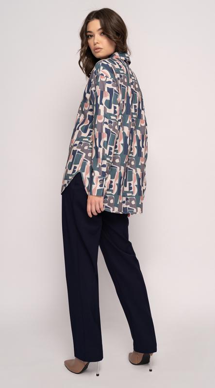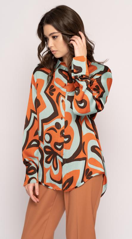 Эффектная рубашка свободного силуэта с отложным воротником на стойке из вискозного крепа с принтом "