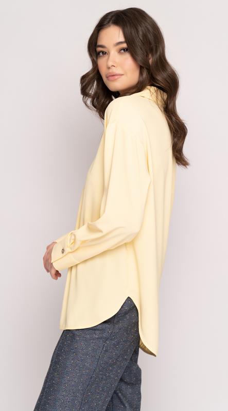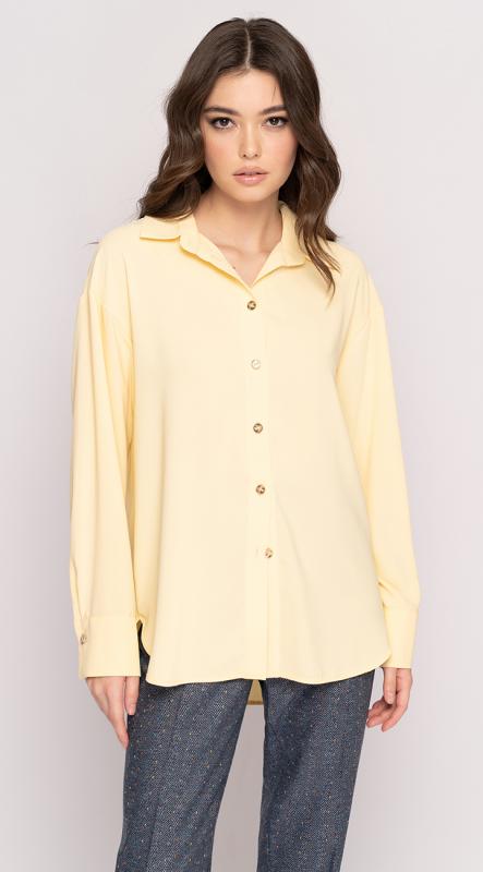 Эффектная рубашка свободного кроя с отложным воротником на стойке из струящейся ткани с эффектом "