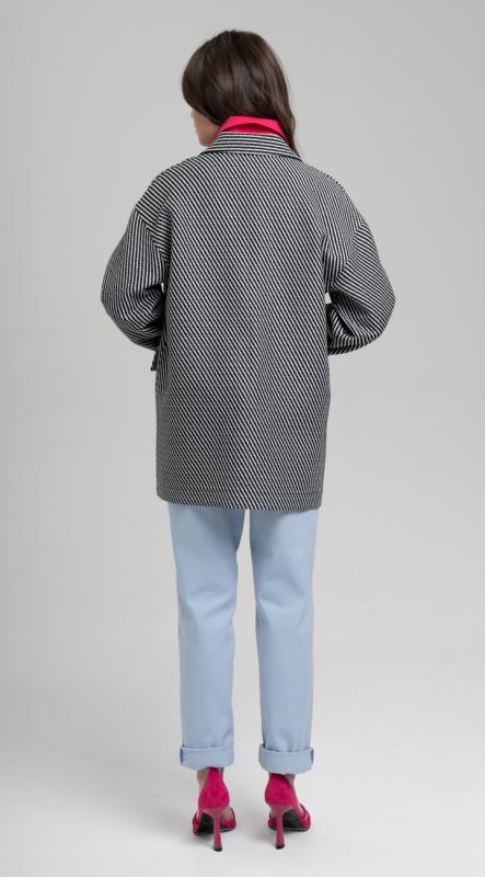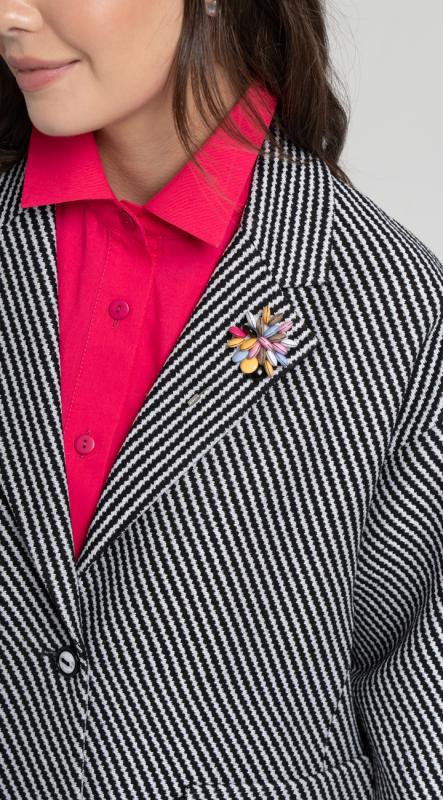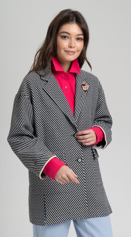 Удлиненный жакет с английским воротником, с разрезами и накладными карманами с клапаном из костюмной поливискозы с хлопком в эффектную полоску - беспроигрышный вариант, который "
