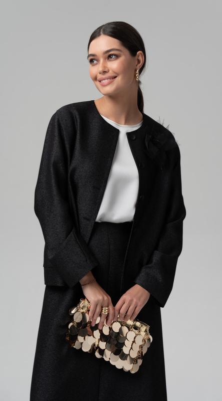 Жакет прямого кроя на притачном поясе в стиле CASUAL из костюмной поливискозы с эффектным мерцанием - позволит создавать эффектные вечерние образы или станет украшением повседневного гардероба. Застежка на петли и пуговицы. Втачной рукав полной длины. Жакет выполнен на подкладе. Добавит хорошего настроения съемная авторская брошь.