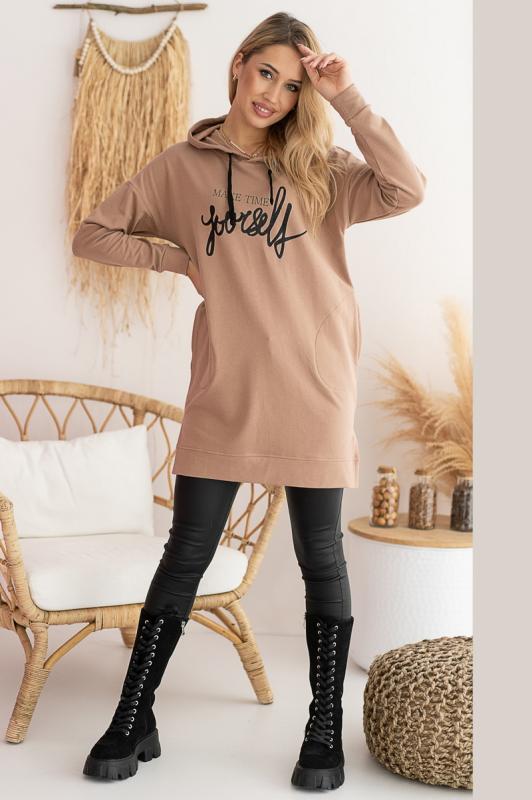 Удобная модная полностью натуральная длинная толстовка с капюшоном и декоративным принтом выполнена из из хлопка высшего качества плотностью 260 гр - м2. Состав: 95% хлопок, 5 % эластан