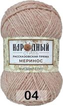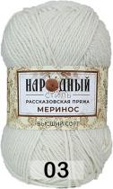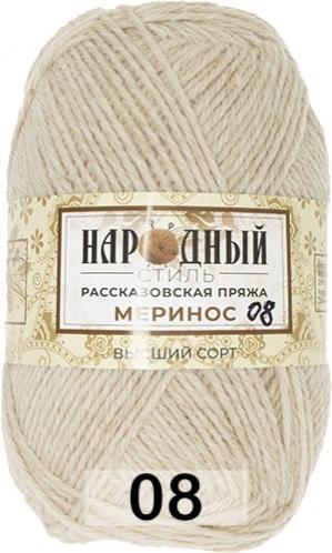 Пряжа Рассказовская Народный Меринос стиль изготовлена из мериносовой шерсти. Подходит для вязания всех типов изделий. Рекомендованы спицы 4,5-5, плотность вязания 26х38. Производитель допускает отклонение по весу +-- 15 гр, по длине нити +-- 20 м.
