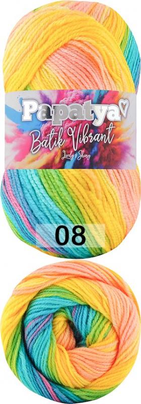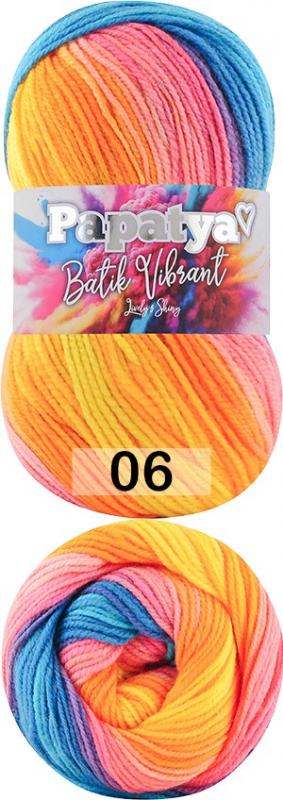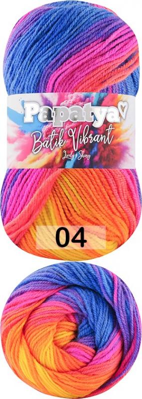 Пряжа Батик Вибрант- это пряжа Papatya Batik в привлекательных расцветках. Ттонкая пряжа, секционной окраски, с плавным переходом цветов. В полотне получаются широкие полосы с регулярным повторением. Идеальна для шарфов, платков, пончо, пледов и пуловеров. Рекомендуемый номер спиц и крючка: 3.5-4