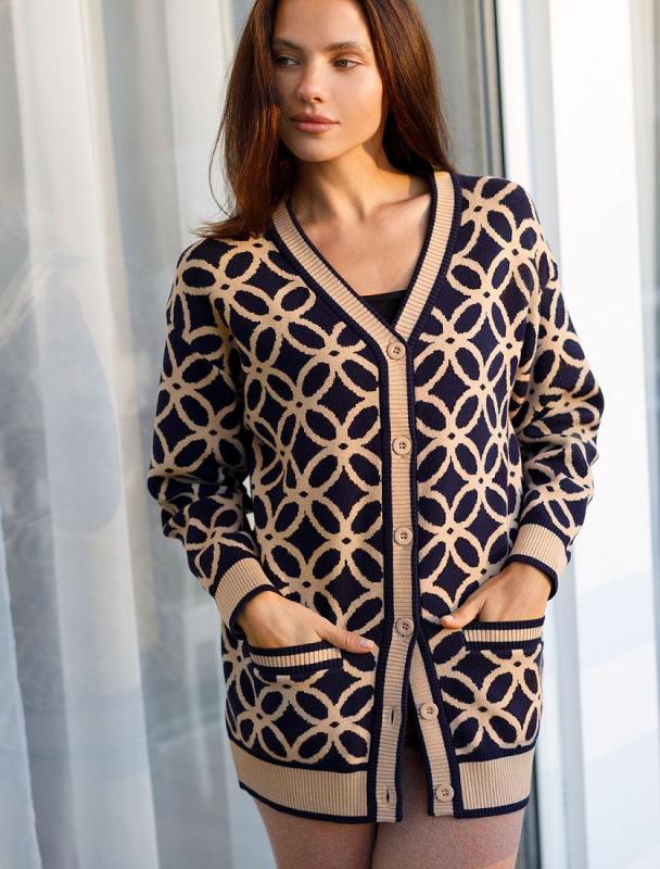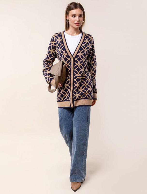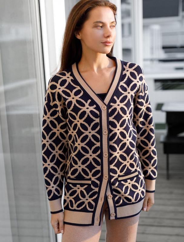 Кардиган жаккардовой вязки выполнен из нежной пряжи на основе вискозы с добавлением кашемира. Мягкая модель не раздражает кожу, приятно ощущается на теле и поддерживает комфортный микроклимат. Совет стилиста: модель гармонично впишется в любой гардероб, добавив образу выразительности. Сочетайте с однотонными брюками, юбкой, платьем или джинсами