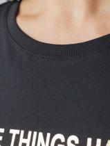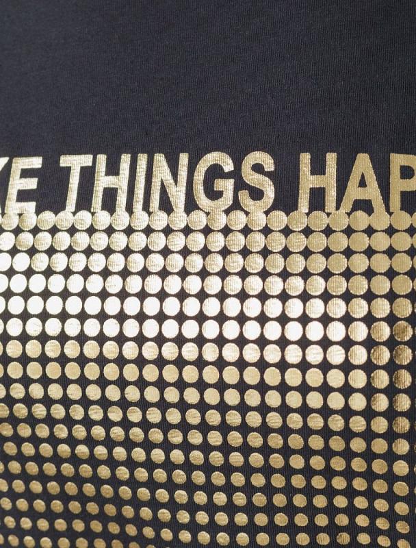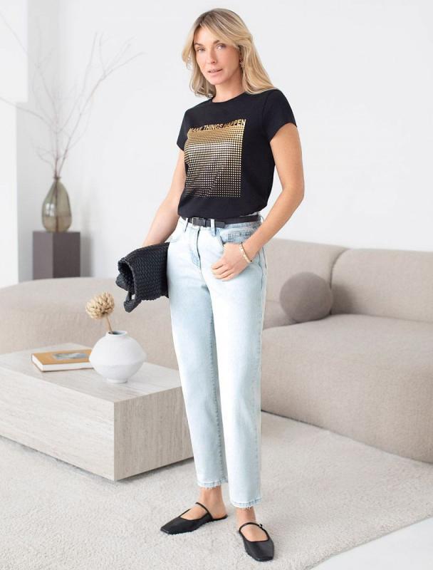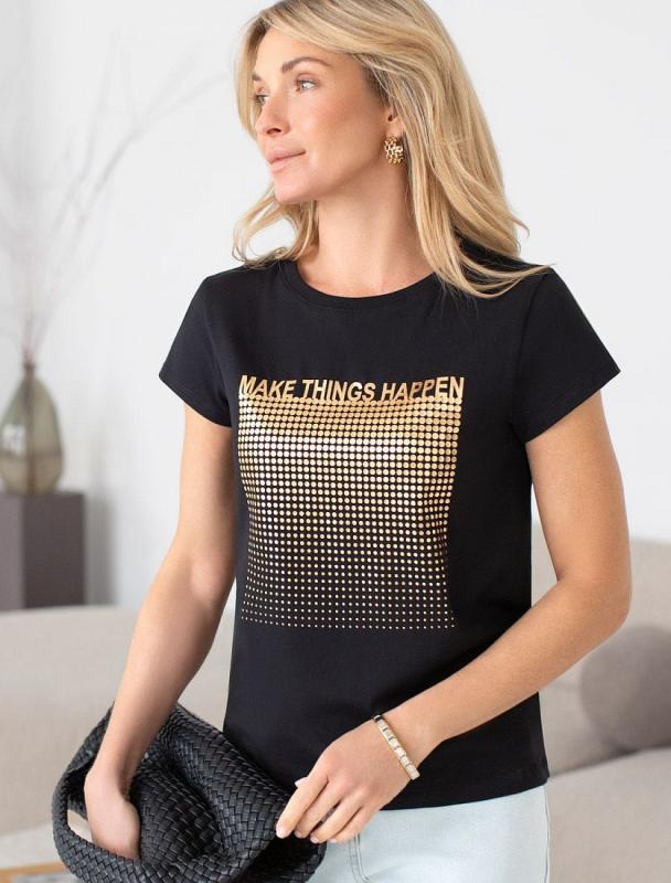 Футболка черного цвета идеально подходит для вечеринки и создания яркого образа. Оригинальный принт из фольги золотистого цвета придает изделию шикарный вид, который привлечет внимание на любом мероприятии. Модель с круглым вырезом и классическим коротким рукавом обеспечивает свободу движений и комфорт в носке. Такой фасон изделия подходит на большие размеры, гармонично сидит на фигуре и помогает создать легкий акцент на достоинствах. Аккуратный круглый вырез красиво подчеркивает шею и делает образ элегантным, сохраняя актуальность для разных случаев — от рабочих встреч до вечерних прогулок и праздничных мероприятий. Модель изготовлена из премиального хлопка с добавлением эластана. Добавление эластана в состав изделия способствует формоустойчивости. Эта нарядная футболка подходит для создания образа на каждый день и идеально подойдет на выход. Модель не мнется, что делает ее практичным вариантом для активных женщин, которые ценят стиль и удобство. Женская футболка подчеркнет вашу индивидуально