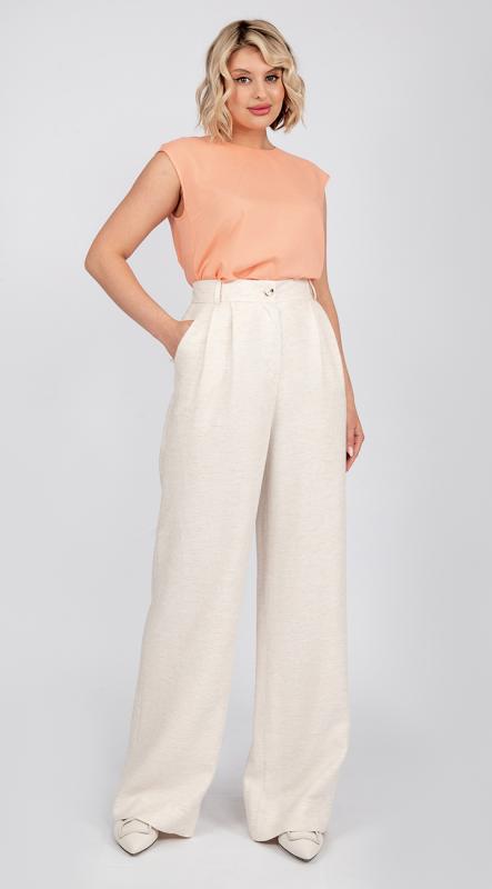 Стильные широкие брюки с 2-мя мягкими защипами по талии изо льна с добавлением волокон вискозы - идеально подойдут для создания как повседневного, так и вечернего образа, если сменить сандалии на изящные босоножки. Брюки с карманами, с удобной посадкой на талии и на притачном поясе с резиной по задней половинке, застегивающиеся на пуговицу.