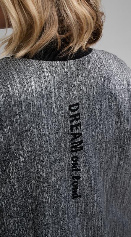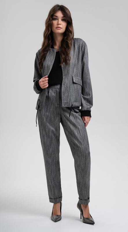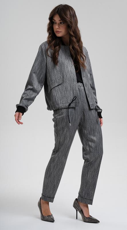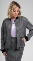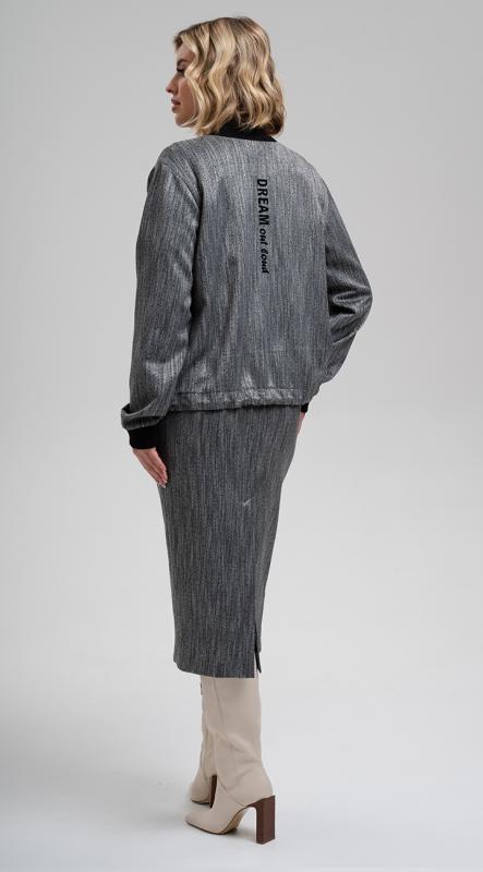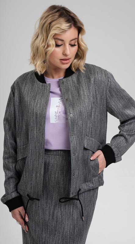 Бомбер прямого силуэта с карманами и кулисой по низу из костюмной поливизкозы с легким мерцанием - станет, несомненно, изюминкой осенне-зимнего гардероба. Авторский термотрансфер из черного бархата - подарит обладательнице хорошее настроение на целый день и без сомнения, сделают образ эффектным и незабываемым. Широкий рукав рубашечного кроя полной длины. Бомбер с манжетами и воротником из трикотажного кашкорсе. Застежка на кнопки.