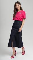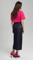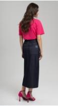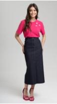 Прямая юбка длиной midi с классической шлицей по переду и спинке, карманами из облегченного денима - сможет с легкостью стать стильной альтернативой для привычного образа CASUAL. Притачной пояс со шлевками и эластичной вставкой по задней половинке. Застежка на молнию и пуговицу-болт по переду. Добавит эксклюзивности авторская вышивка на кармане на задней половинке.