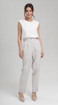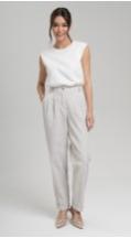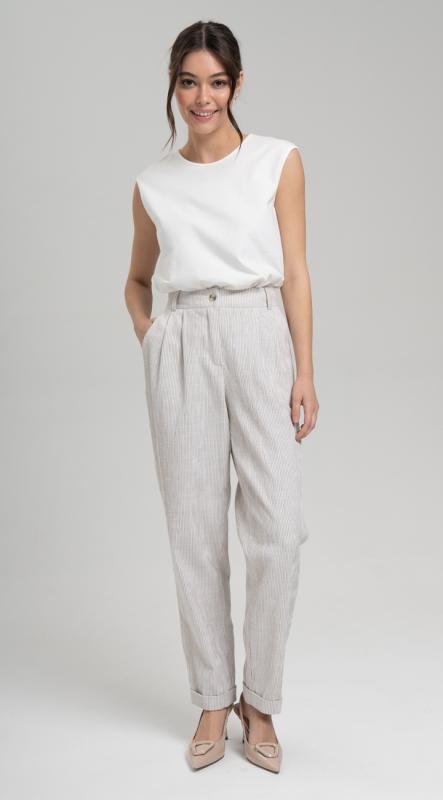 Эффектные брюки из новой коллекции из хлопка в тонкую фактурную полоску с защипами по талии, с карманами, на притачном поясе-кокетке с резиной по задней половинке брюк, застегивающимся на пуговицу - безупречно подчеркнут любую фигуру. Брюки с отворотами по низу.