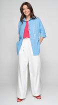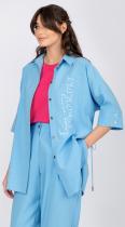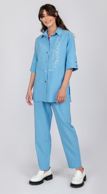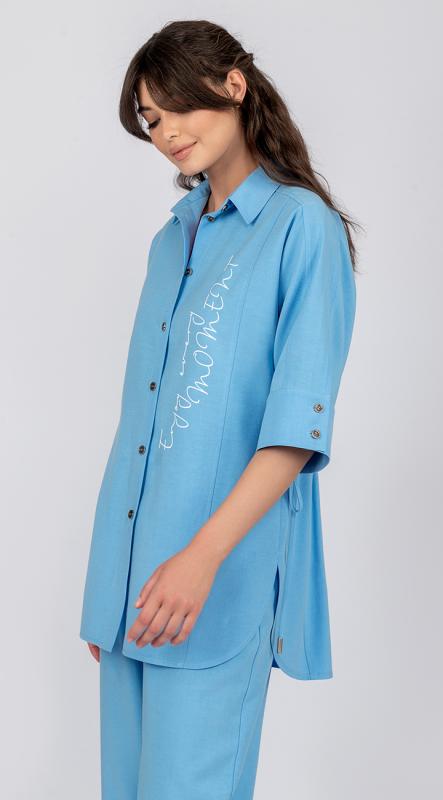 Рубашка свободного силуэта с коротким цельнокроенным рукавом на притачной манжете, застегивающейся на пуговицы, с кулисой по талии изо льна с добавлением волокон хлопка и вискозы - с легкостью позволит создать миловидный образ и не оставит никого равнодушным. Застежка на петли и пуговицы. Добавит эксклюзивности термотрансфер из белого бархата по переду.