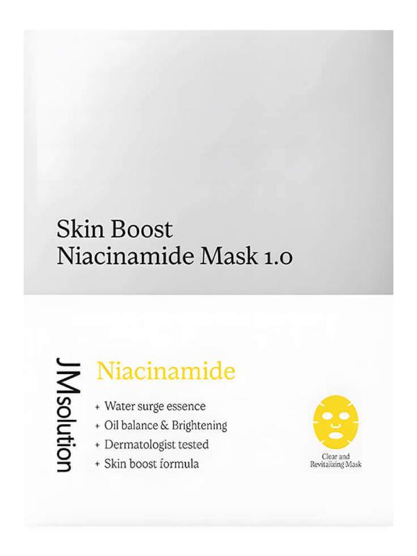 Тканевая маска-бустер с ниацинамидом JMsolution Skin Boost Niacinamide Mask 1.0 регулирует работу сальных желёз, способствует сужению расширенных пор и осветляет сальные нити. Поглощает излишки себума и растворяет комедоны, матирует. Обладает антибактериальным и противовоспалительным действием, снижает риск развития акне. Помогает в борьбе с гиперпигментацией и постакне, предотвращает их появление. Основные действующие компоненты: Ниацинамид (витамин B3, 5%) замедляет доставку меланина к эпидермису, за счёт чего предотвращает образование пигментных пятен. Регулирует выработку себума, уменьшает жирный блеск, сужает поры. Цинк регулирует работу сальных желёз и предотвращает чрезмерную выработку себума. Уменьшает жирность кожи, обеззараживает, оказывает мягкое вяжущее действие. Ускоряет процессы, отвечающие за регенерацию и восстановление. Морская вода тонизирует, насыщает минералами, устраняет сухость, повышает абсорбирующую способность кожи. Лактобактерии (Lactobacillus Ferment, Bacillus Ferment) снижают чувс