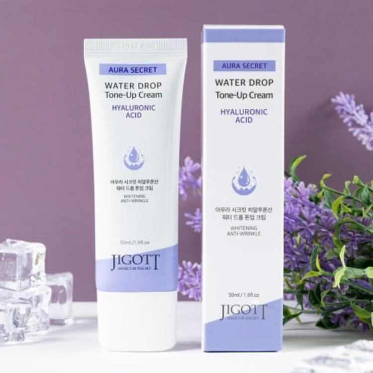 Осветляющий крем с гиалуроновой кислотой Jigott Aura Secret Hyaluronic Acid Water Drop Tone Up Cream улучшает внешний вид кожи, оздоравливает ее. Он глубоко гидрирует, наполняет кожу влагой, делает ее наполненной и шелковистой. Он выравнивает тон, осветляет кожу, стирает следы усталости и стресса. Гиалуроновая кислота 1% в составе увлажняет кожу и предотвращает испарение влаги, она разглаживает рельеф, устраняет мелкие морщинки, делает кожу наполненной и сияющей. Экстракт коптиса японского в составе успокаивает кожу, снимает покраснения, слегка понижает температуру кожи, что крайне полезно для ее здоровья. Он обладает высокими противовоспалительными и антисептическими свойствами, борется с бактериями на поверхности кожи, укрепляет ее иммунитет и повышает защитные функции. Крем дарит коже ощущение комфорта и ухоженный, цветущий вид. Крем увлажняет кожу, делает ее свежей и наполненной. Он успокаивает раздражения, выравнивает тон, мягко осветляет ее. Делает кожу упругой и ухоженной. Активные ингредиенты Ниацина