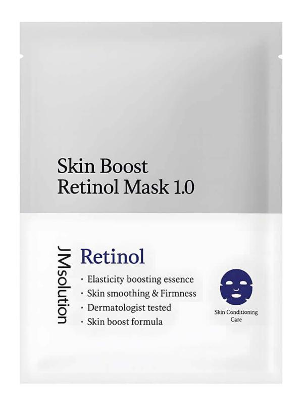 Тканевая маска-бустер с ретинолом JMsolution Skin Boost Retinol Mask 1.0 запускает клеточную регенерацию, обладает омолаживающим свойством и замедляет процессы старения. Борется с тусклостью и выравнивает тон, увлажняет и предотвращает появление шелушения. Смягчает огрубевшую кожу и разглаживает микрорельеф, повышает проницаемость тканей. Стимулирует синтез коллагена и поддерживает эластичность, способствует разглаживанию морщин. Не провоцирует сухости и раздражения. Основные действующие компоненты: Ретинол (витамин A, 10 ppm) при попадании в эпидермис трансформируется в ретиналь, затем в ретиноевую кислоту — самую эффективную форму витамина A. Оказывает антивозрастное действие: стимулирует синтез коллагена, разглаживает морщины. Сужает поры, нормализует выработку себума. Пантенол (витамин B5) ускоряет заживление микроповреждений, смягчает и успокаивает, снимает покраснение, усиливает барьерные функции. Морская вода подсушивает воспаления, тонизирует, насыщает минералами, устраняет сухость, повышает абсорбир