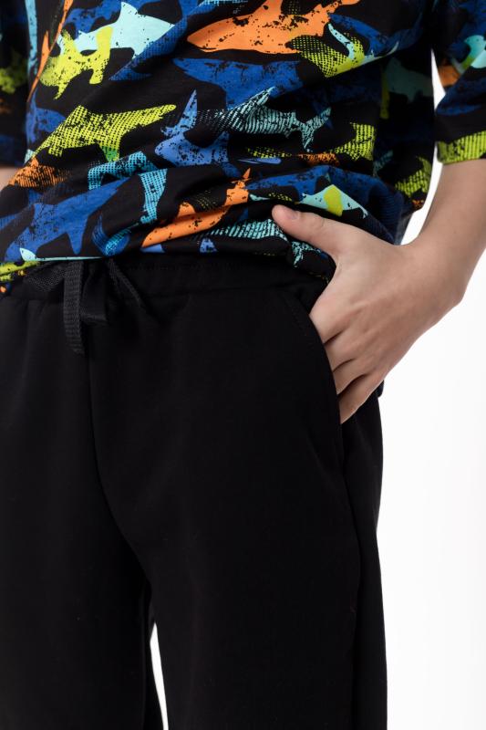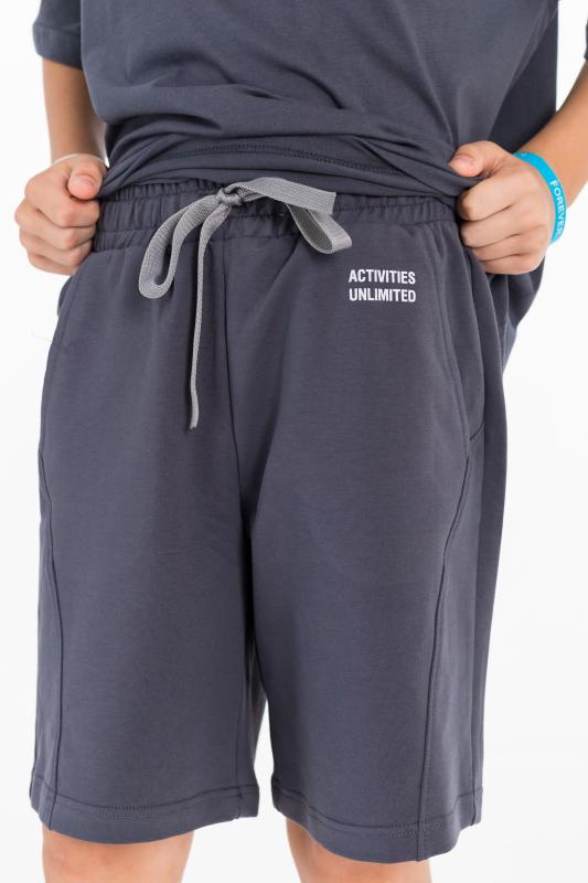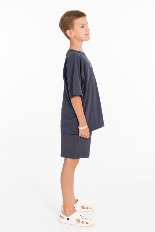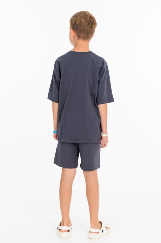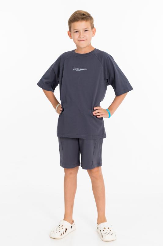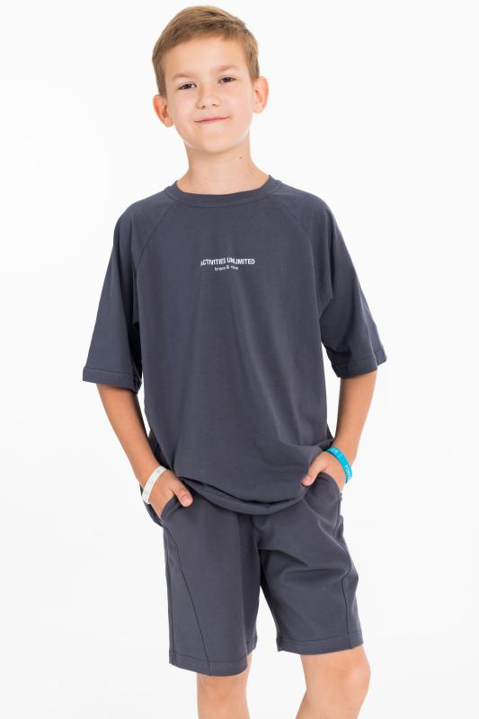 Костюм состоит из шорт и футболки. Футболка из однотонной кулирки, свободного покроя, с рукавами реглан. Шорты из однотонного футера, с притачным поясом со шнуром и боковыми карманами. На футболке и шортах нанесён принт.