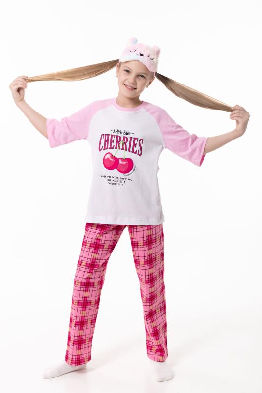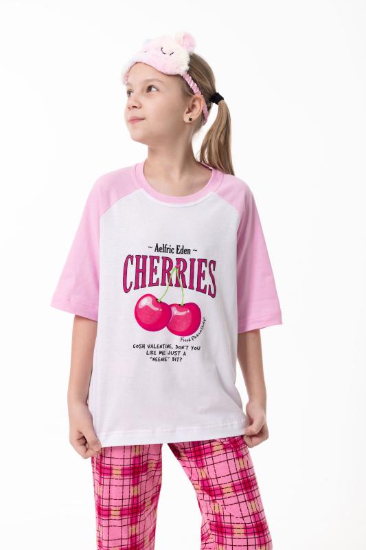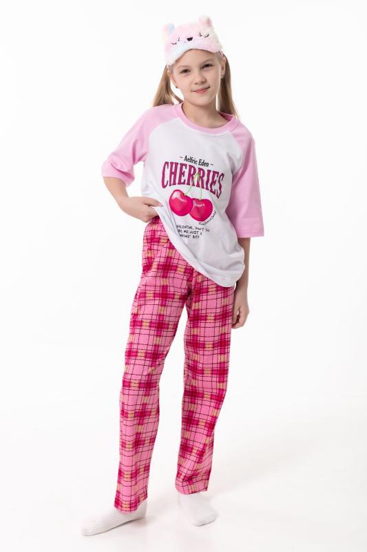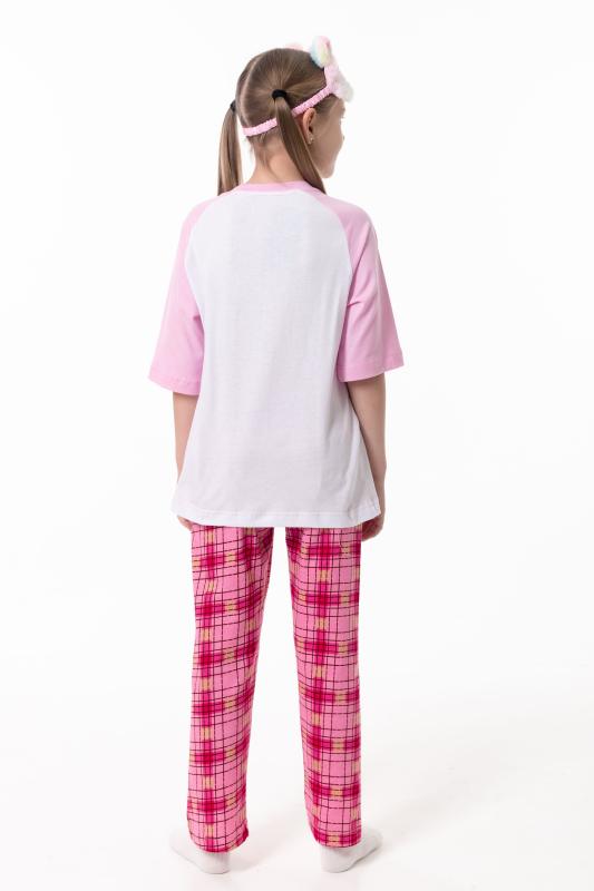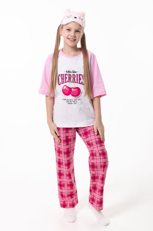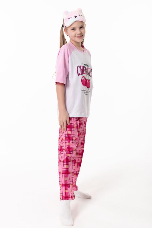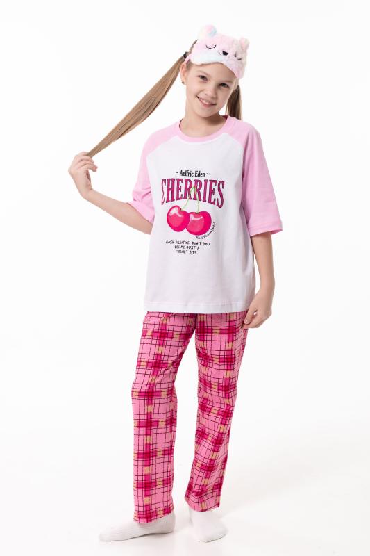 Пижама для девочек выполнена из мягкой и приятной к телу кулирки, обеспечивающей комфорт во время сна и отдыха. Комплект состоит из футболки с круглым вырезом горловины и рукавами реглан из отделочного полотна. Спереди изделие украшено аккуратным принтом. Брюки прямого кроя выполнены с поясом на резинке, без карманов, что обеспечивает удобную посадку и свободу движений. Пижама отлично подойдёт для повседневного использования дома.
