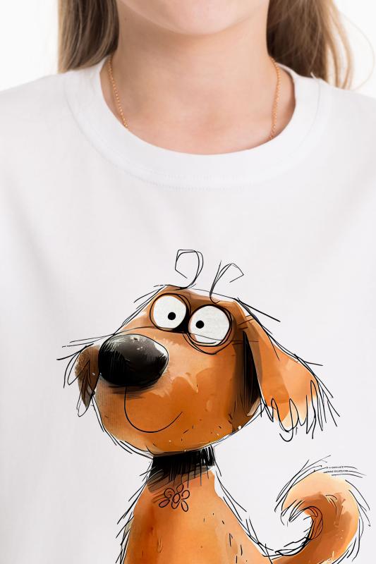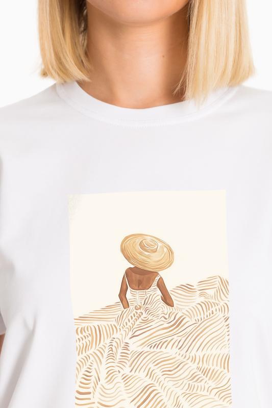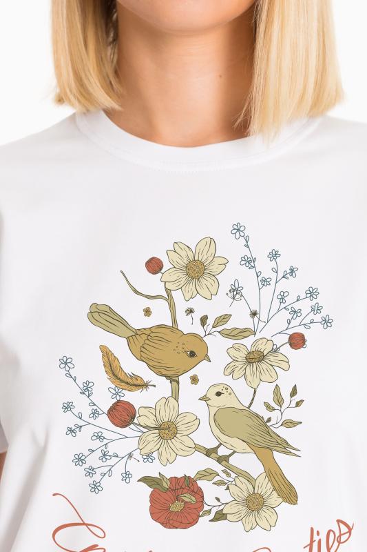Женская футболка с принтом изготовлена из хлопкового полотна с добавлением лайкры, что обеспечивает комфорт и хорошую воздухопроницаемость. Футболка имеет короткий рукав и круглый вырез горловины, что придает ей классический стильный вид. Такая модель футболки отлично сочетается с джинсами, брюками или юбкой. Изготовленная из натуральной ткани, футболка обеспечит комфорт в течение всего дня.
