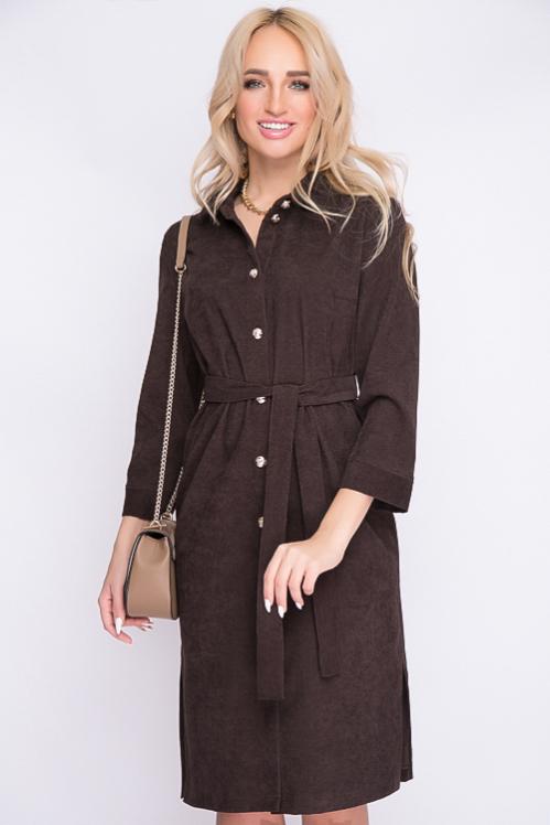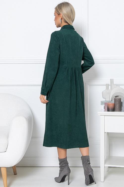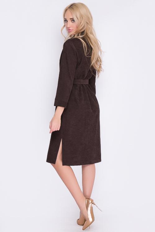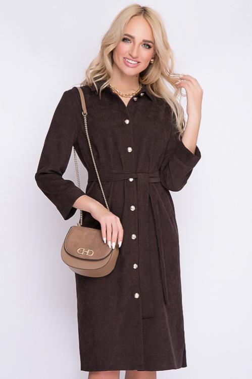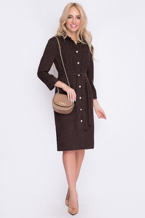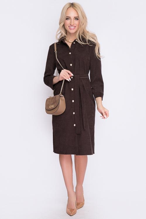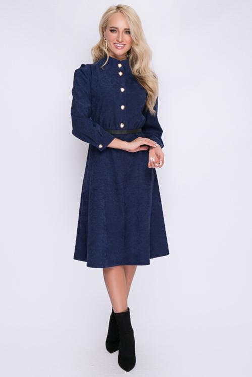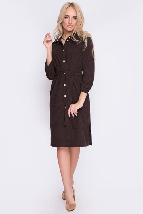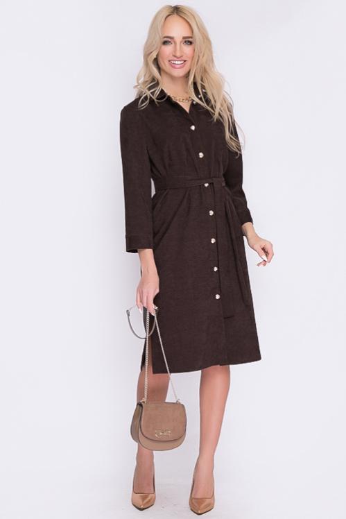Платье из микровельвета свободного силуэта.По переду центральная застежка на пуговицы до низа и функциональные карманы.Воротник отложной на стойке. Cостав: 50% вискоза,45% п-э,5% лайкра