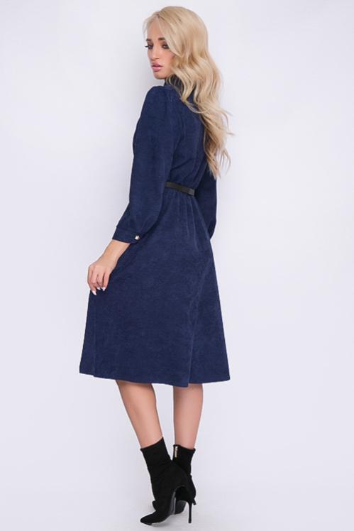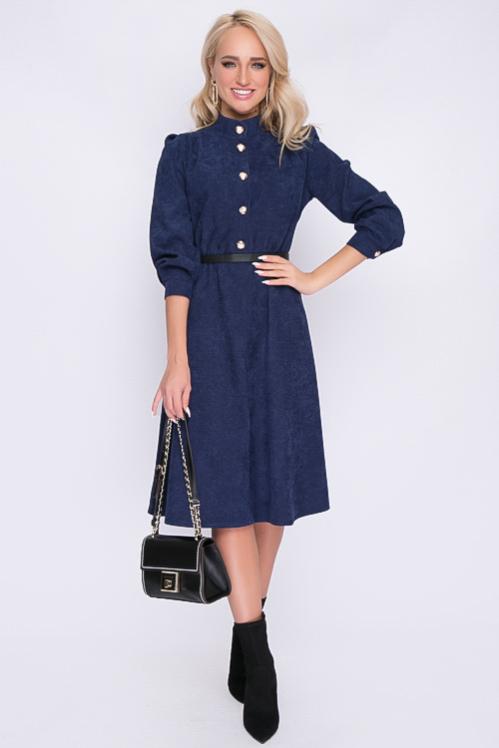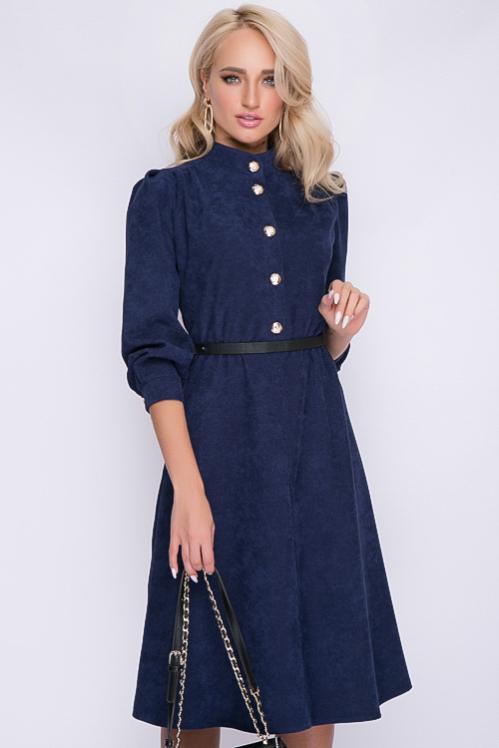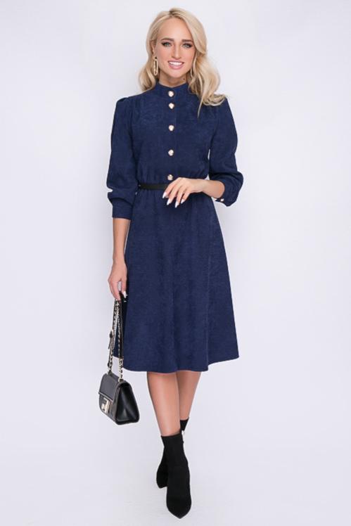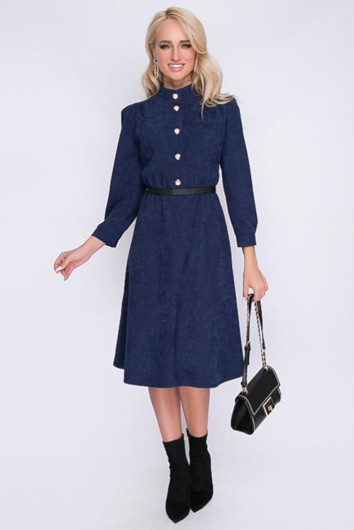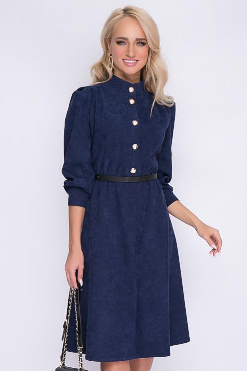 Платье из микровельвета отрезное по линии талии.Горловина с воротом стойка,с застежкой на пуговицы до талии. Cостав: 50% вискоза,45% п-э,5% лайкра