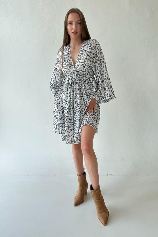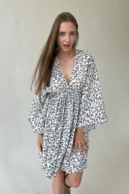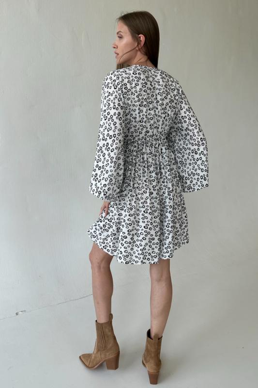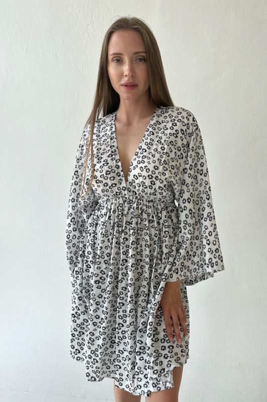Платье мини из 100% вискоза в мелкий цветочек. Рукава - широкие. Талия на резинке под грудью. Рост модели 174 см.