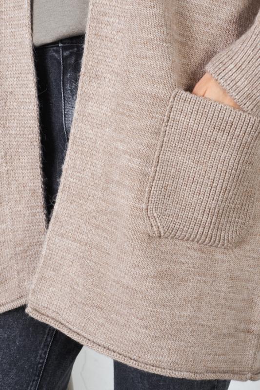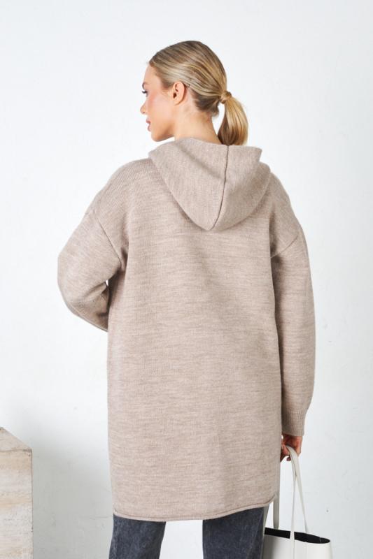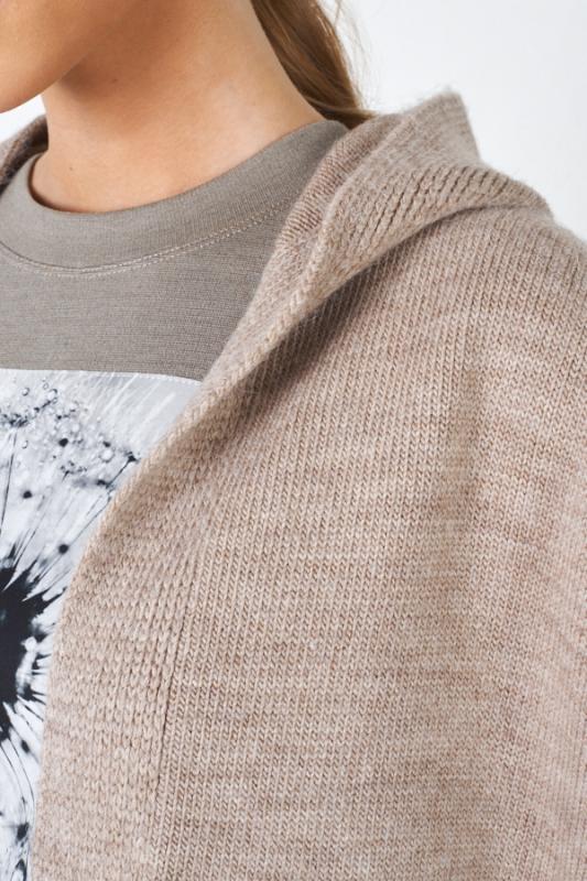Кардиган свободного силуэта с капюшоном, со спущенной линией плеча и длинным рукавом. На передней части изделия выполнены карманы. Низ изделия и низ рукава оформлены резинкой. Изделие выполнено из мягкой меланжевой пряжи.